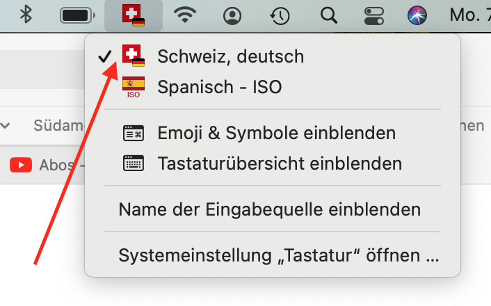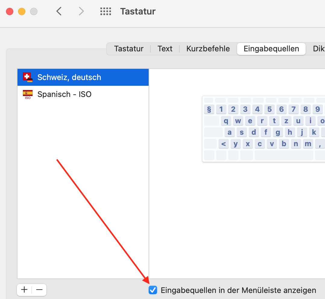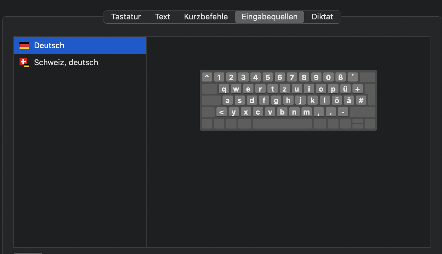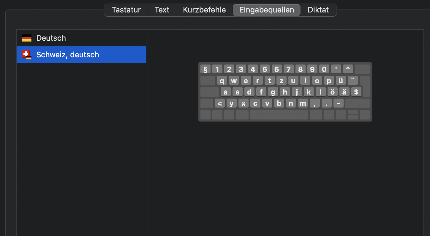 - Systemeinstellungen > Tastatur > Eingabequellen: Schweiz, Deutsch