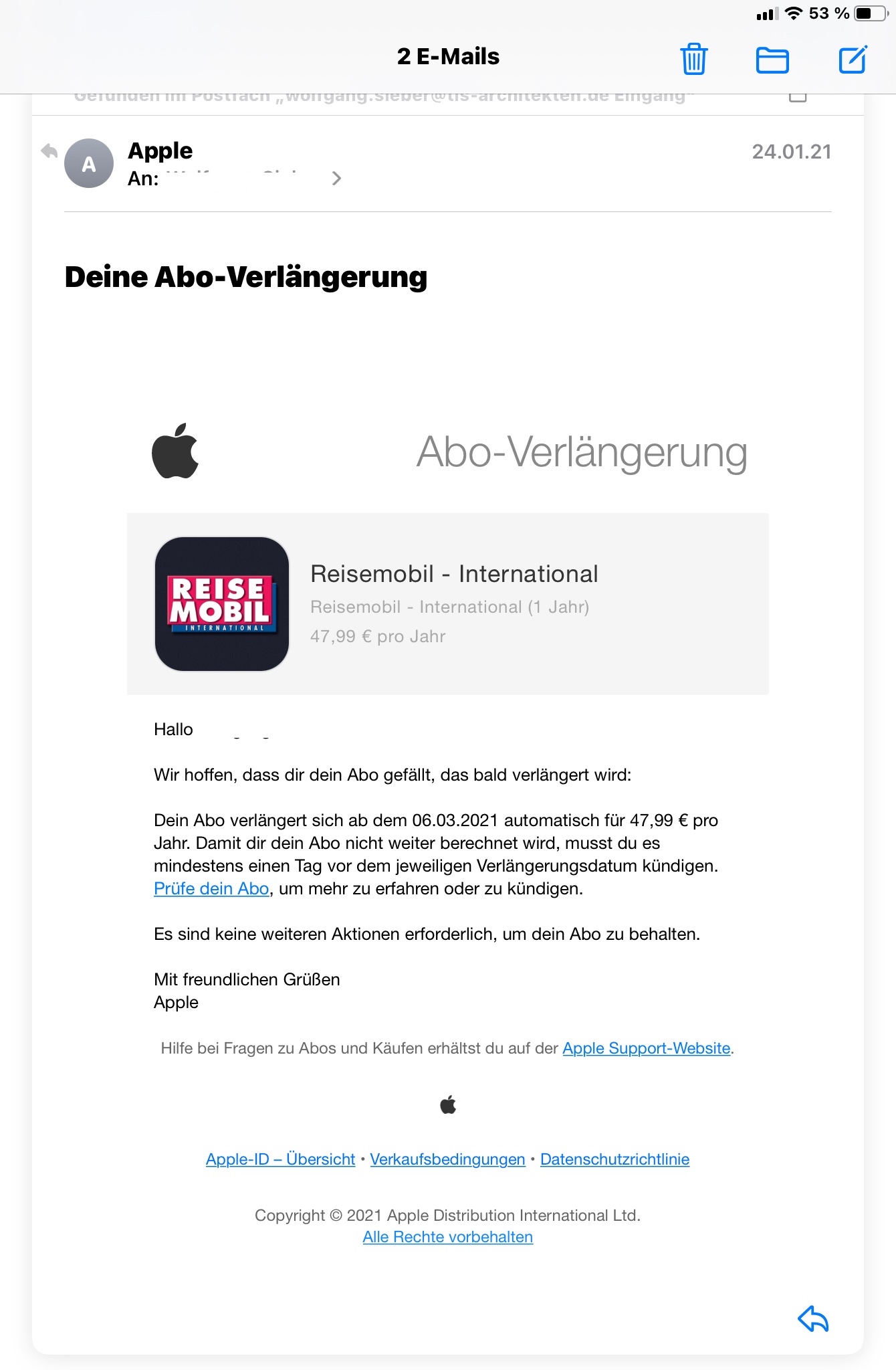 In deinem Fall ist es erforderlich (gem. Empfehlungen von Apple) mit dem Support von Reisemobil International Kontakt aufzunehmen, welcher alleinig für die Weiterentwicklung und Bereitstellung seiner diesbezüglichen Software und Leistungen verantwortlich ist.