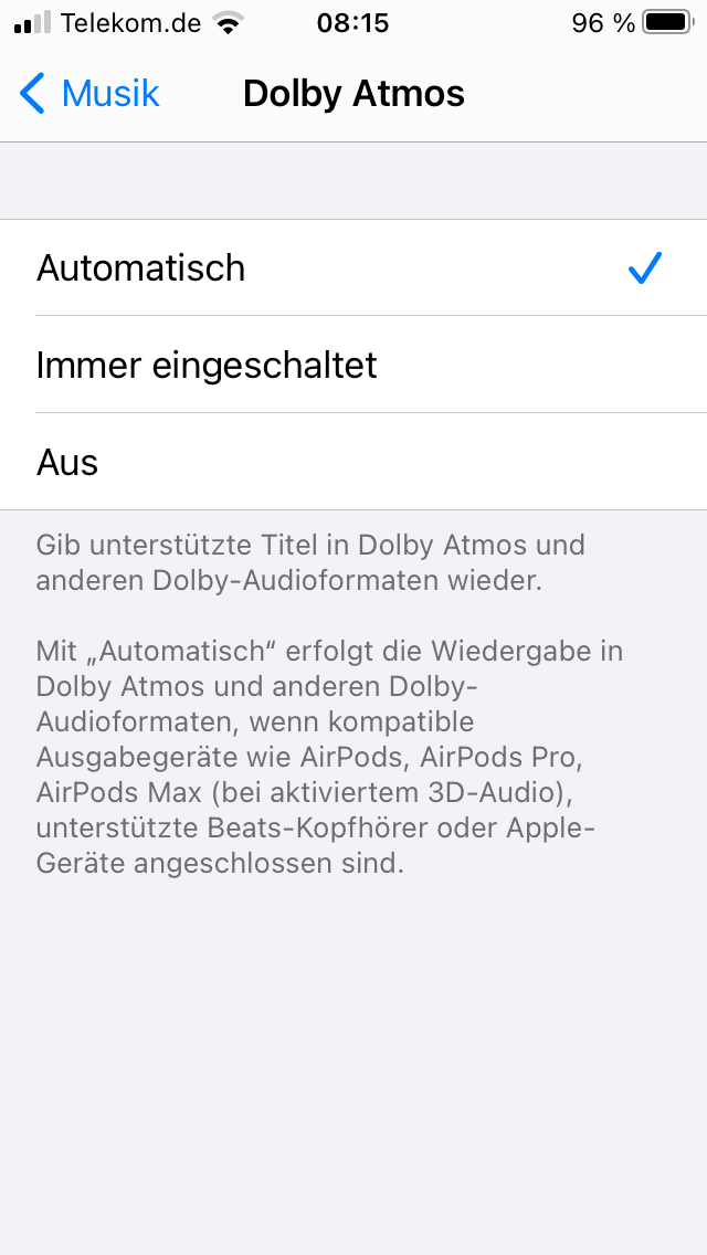 Ich war heute im Apple Store in Oberhausen und die Mitarbeiter haben mir zunächst gar nicht geglaubt! Auf der Apple support Seite wird ganz klar gezeigt, dass der blaue 3D-Audio-Button nur die Aktivierung des 3D-Audio in wartestellung, nicht jedoch den aktive 3D-Sound anzeigt. Dies wird auf der Seite https://support.apple.com/de-de/HT211775 ganz deutlich gezeigt. Das 3D-Audio Zeichen muss animiert sein, so wie es animiert ist, sobald ich Dolby Atmos Filme Abspiele, zum Beispiel Harry Potter Teil 5. Bei sämtlichen 3D-Audio inhalten in Music kann ich keinen 3D-Sound hören und das Logo bleibt und alles hört sich an als wäre es ausgeschaltet. Die Mitarbeiter im Apple store wollten mir erklären, dass es sich aber toll anhört. Das Stimmt, dies ist eine gute Stereo Wiedergabe! Wie bekomme ich endlich 3D-Sound auf meine Ipod Max?!