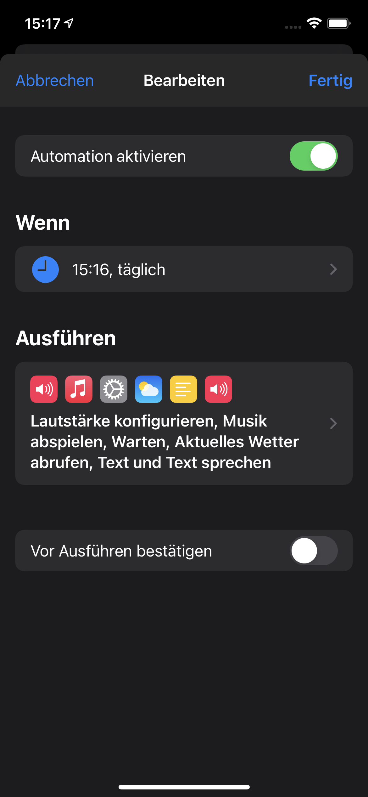 ich habe einen Kurzbefehl erstellt der mir ab einer bestimmten Uhrzeit ein Musiktitel abspielt was auch super funktioniert.