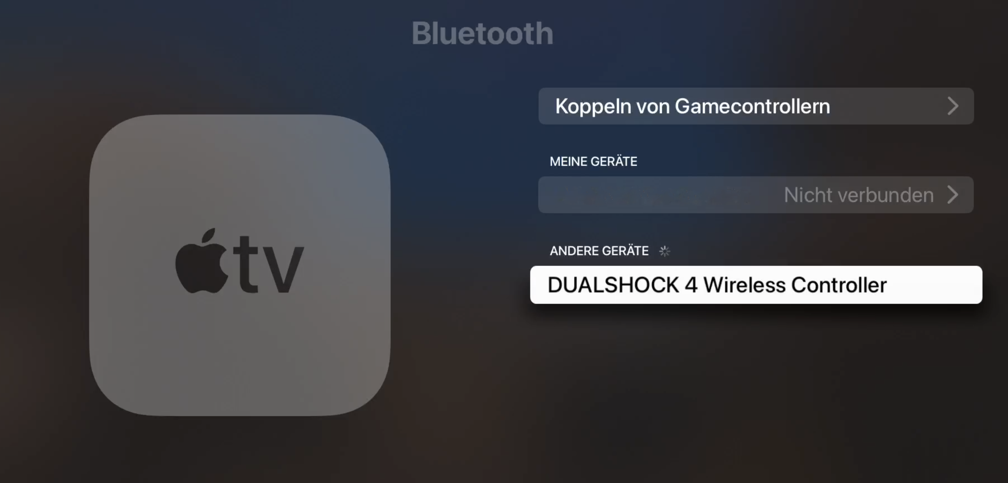 Beim Apple TV sehe ich sofort DUALSHOCK 4 Wireless Controller unter ANDERE GERÄTE in den Bluetooth - Einstellungen. Mit einem Klick darauf, wird der Controller verbunden.