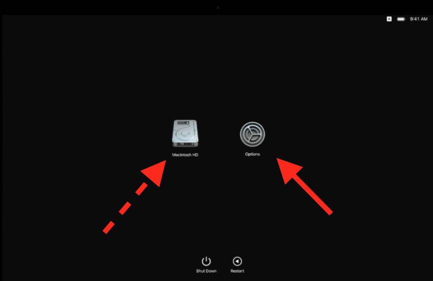 Schalte ihn aus und warte 10 Sekunden, dann den Einschaltknopf solange drücken bis die Startoptionen auf dem Bildschirm erscheinen