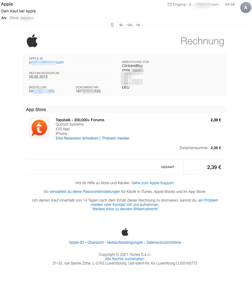 2021 App Store Bestätigung eMail für Kauf einer App aus 2012 erhalten?! (Tapatalk)
