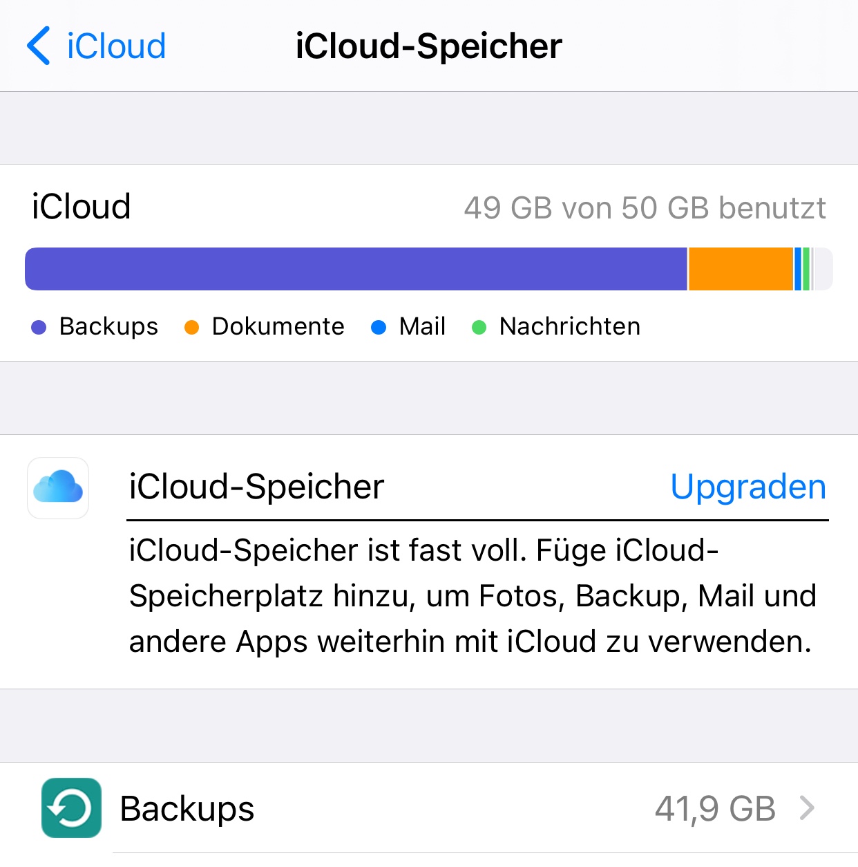 Von meinen verfügbaren 50GB habe ich 49 GB benutzt, wobei die Backups 41,9GB einnehmen. Was kann ich machen, um wieder mehr Speicherplatz zu bekommen, ohne weiteren Speicherplatz zu kaufen? Kann ich Backups löschen oder gehen dann viele Daten verloren?