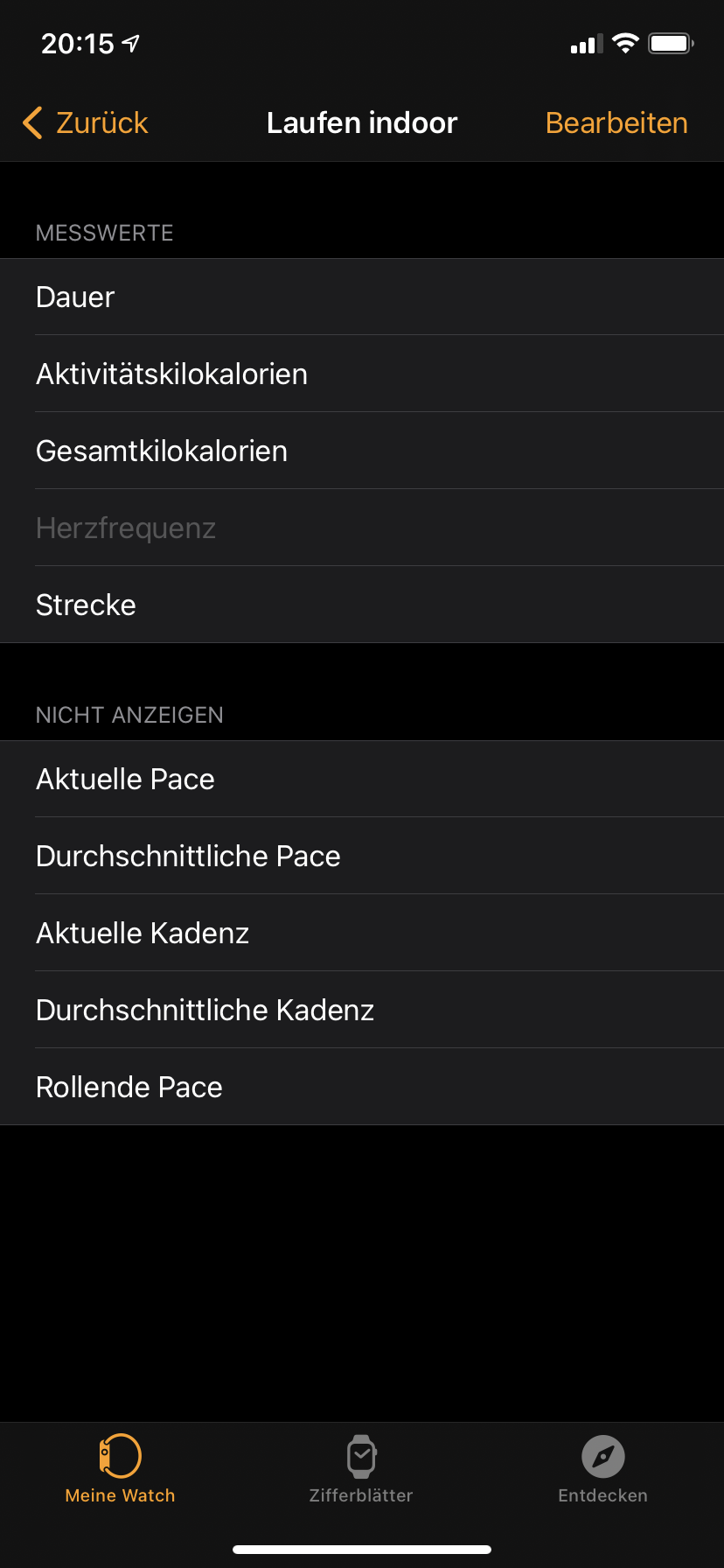 Du kannst in der Watch App auf dem iPhone einstellen, was bei dem Training angezeigt werden soll. Gehe dazu in der App auf Training und dann oben auf Trainingsansicht.