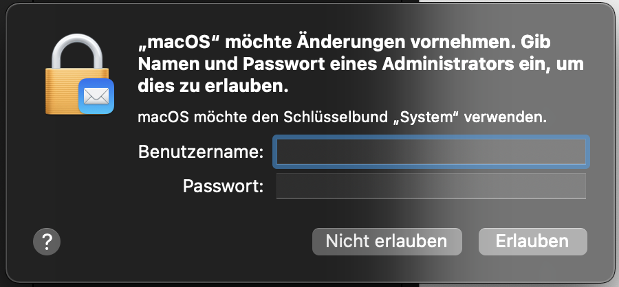 Ich nutze die Mail-App auf meinem MacBook Air M1 2020 und bekomme bei jeder Mail (verwende ne @icloud-Mail-Adresse), die ich versenden will, die Aufforderung, den Namen und Passwort des Administrators (gibt nur einen) einzugeben. Wenn ich das nicht mache, wird die Mail nicht versendet.