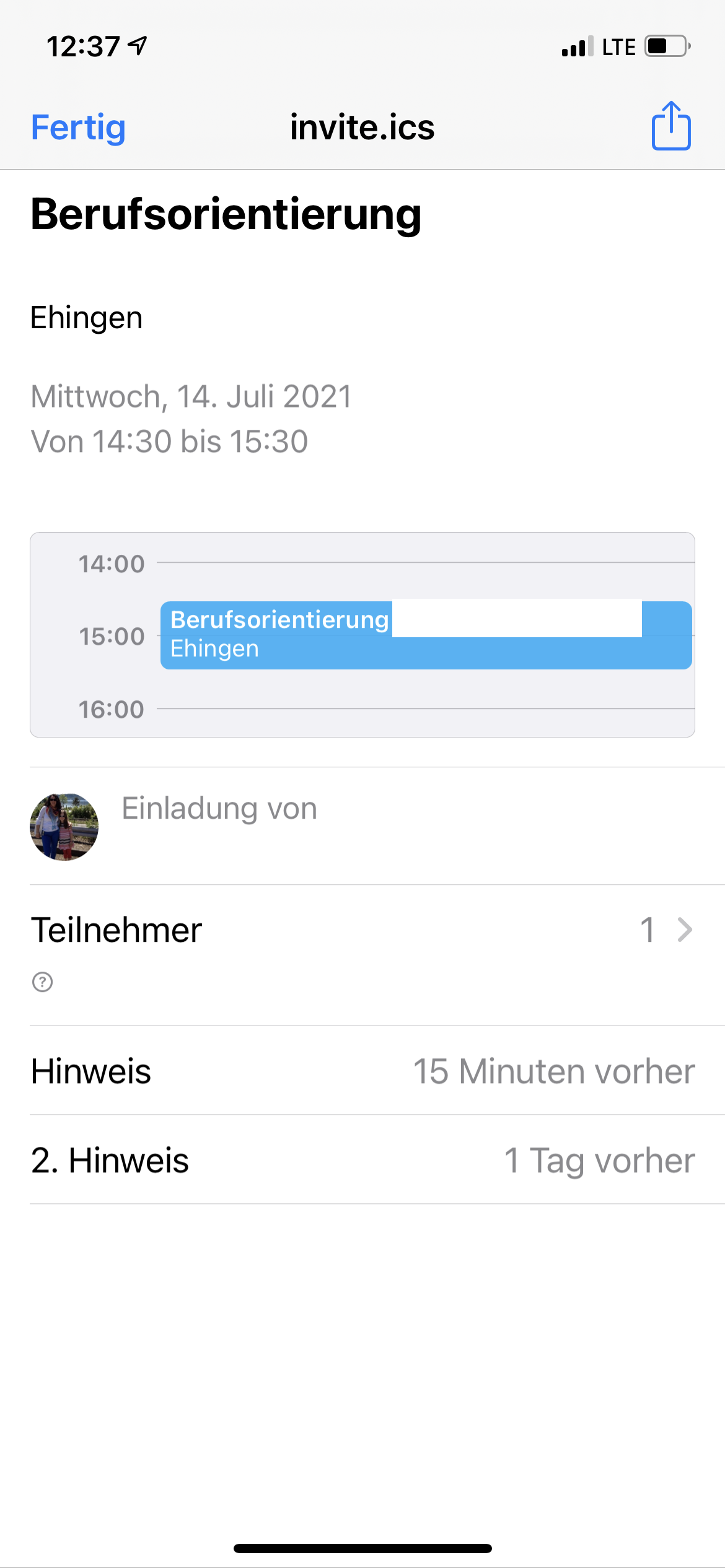 Ich kann die Einladung zwar öffnen, jedoch nicht im AppleKalender eintragen. Es fehlt „Hinzufügen“.