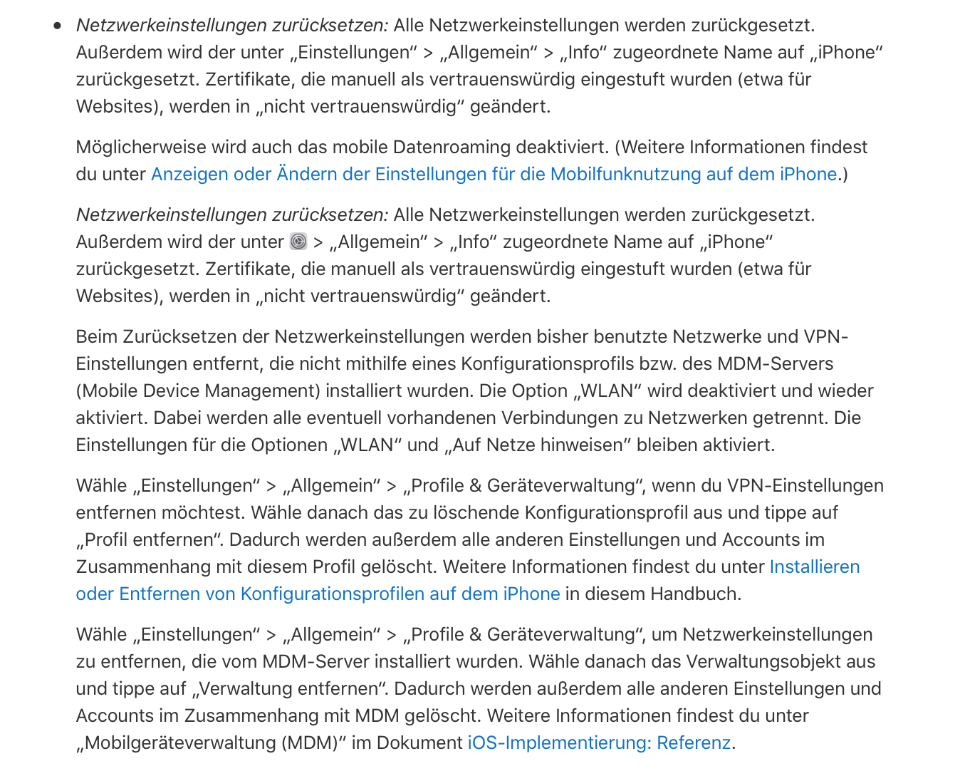 ein Auszug aus der u.a. Seite des Apple Support zeigt dir die Auswirkungen, wenn du die Netzwerkeinstellungen zurücksetzt