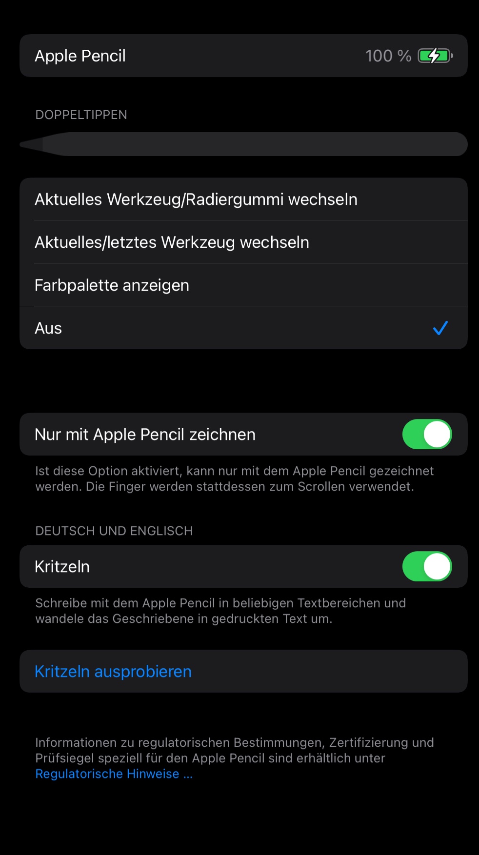 Doppeltippen beim Apple Pencil funktioniert nicht, aber normales Zeichnen schon.