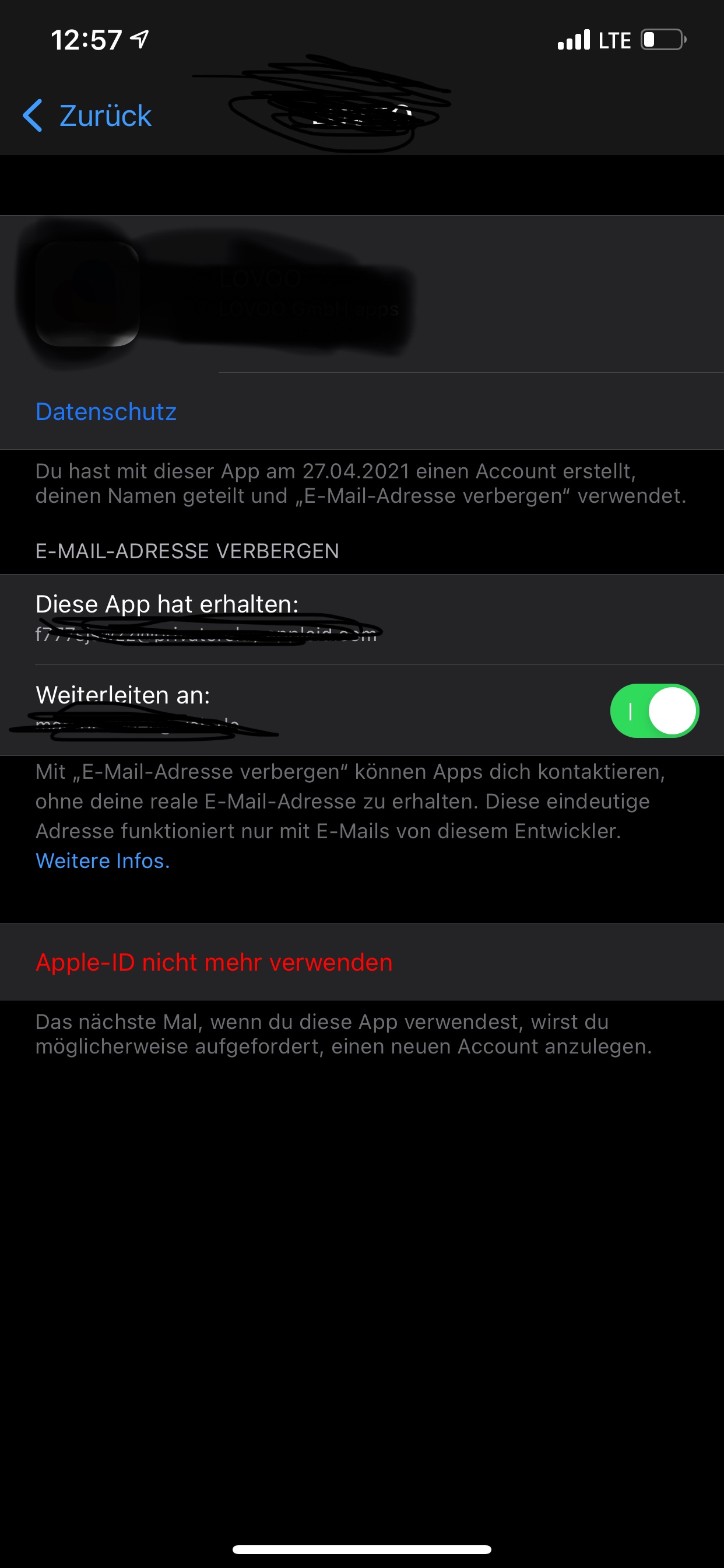 Die Weiterleitung von Apps mit Apple Anmeldung funktioniert nicht. Ich erhalte keine Email weiter geleitet an meine Originale verborgene Adresse obwohl aktivierter Weiterleitung
