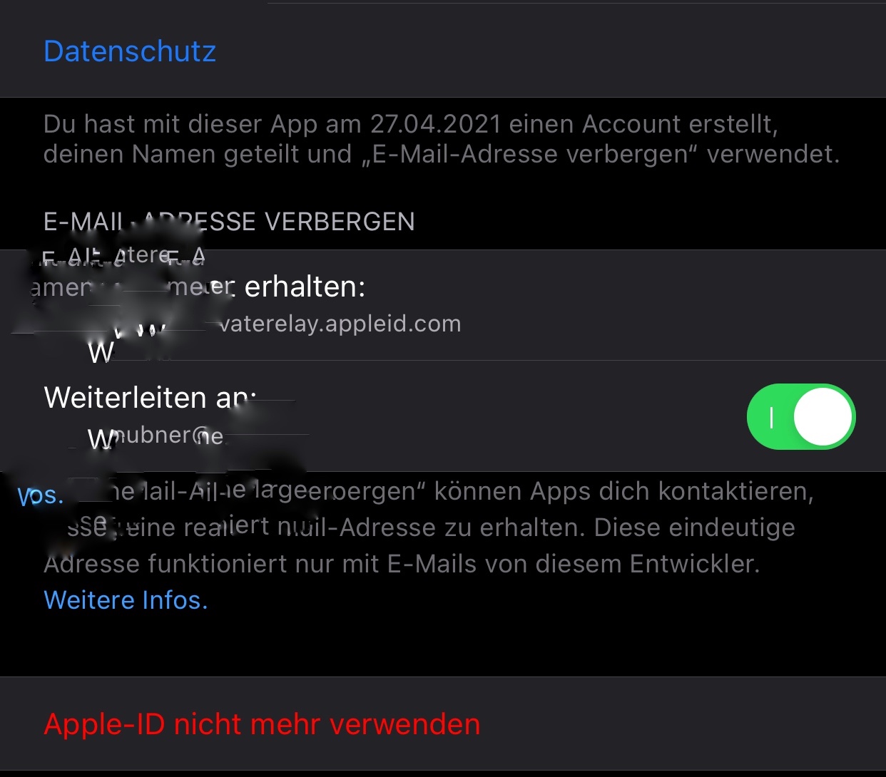 Hallo, die Weiterleitung ist unter Einstellungen/ Meine Daten mit Apple anmelden, und der jeweiligen App aktiviert. Aber von der App bzw dem Verein ausgegebene Emails werden nicht an meine Original hinterlegte Email weitergeleitet.