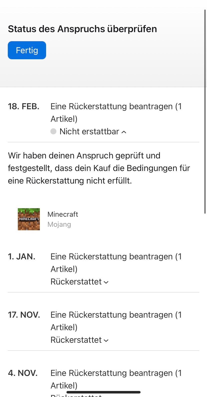Ich hatte mal das Spiel Minecraft Rückerstattet und ich dachte das ich das Geld schon längst bekommen hätte doch beim überpfeffern stand das dieser Artikel nicht rückerstattet werden kann … warum ?