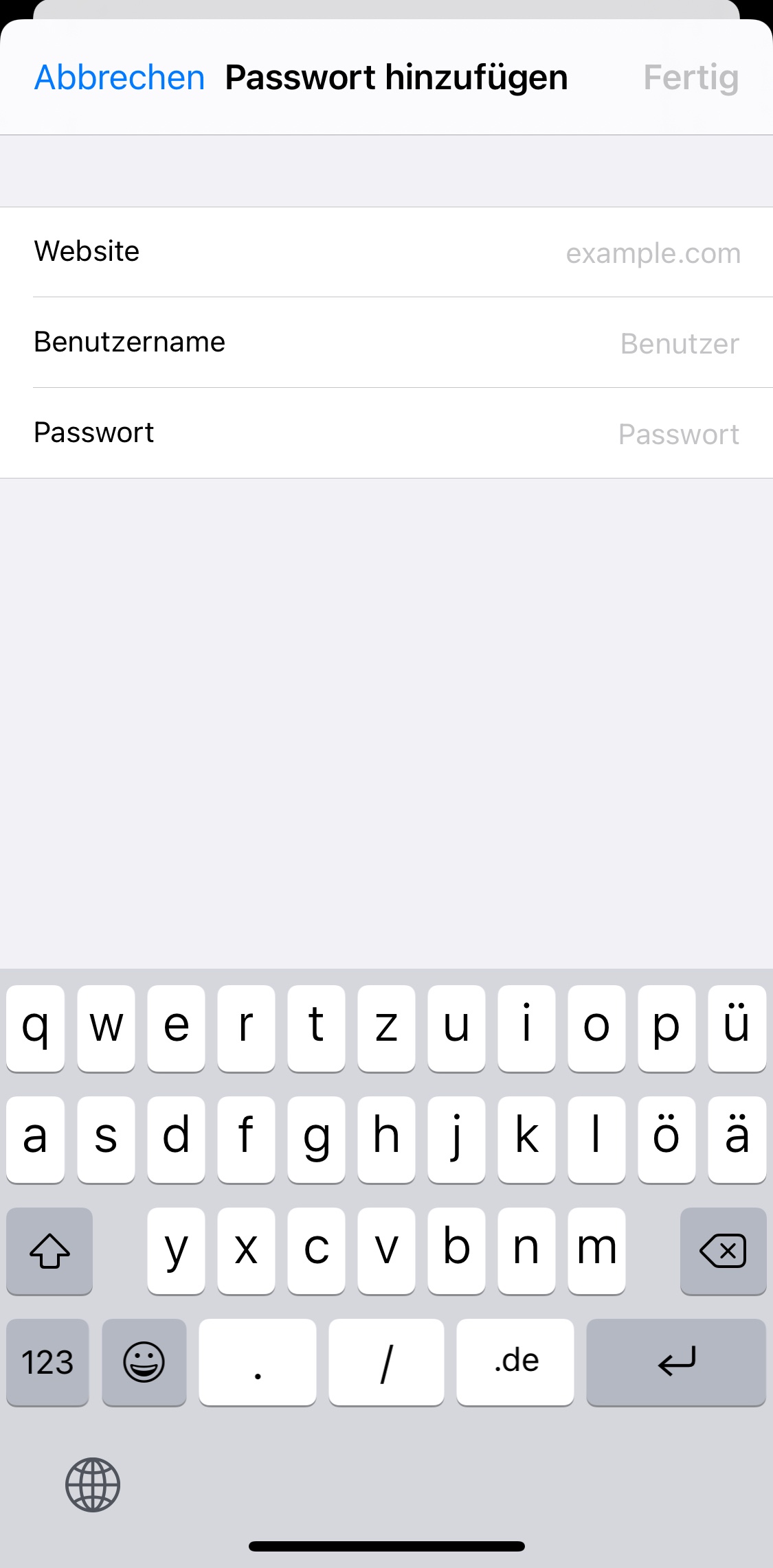 vielen Dank für die prompte Antwort. Leider klappt das nicht. Wenn ich über Passwörter das + anwähle, kann ich keine App wählen und auch keinen App-Namen eingeben. Es gibt nur 3 Felder: Webseite, Benutzer und Passwort.