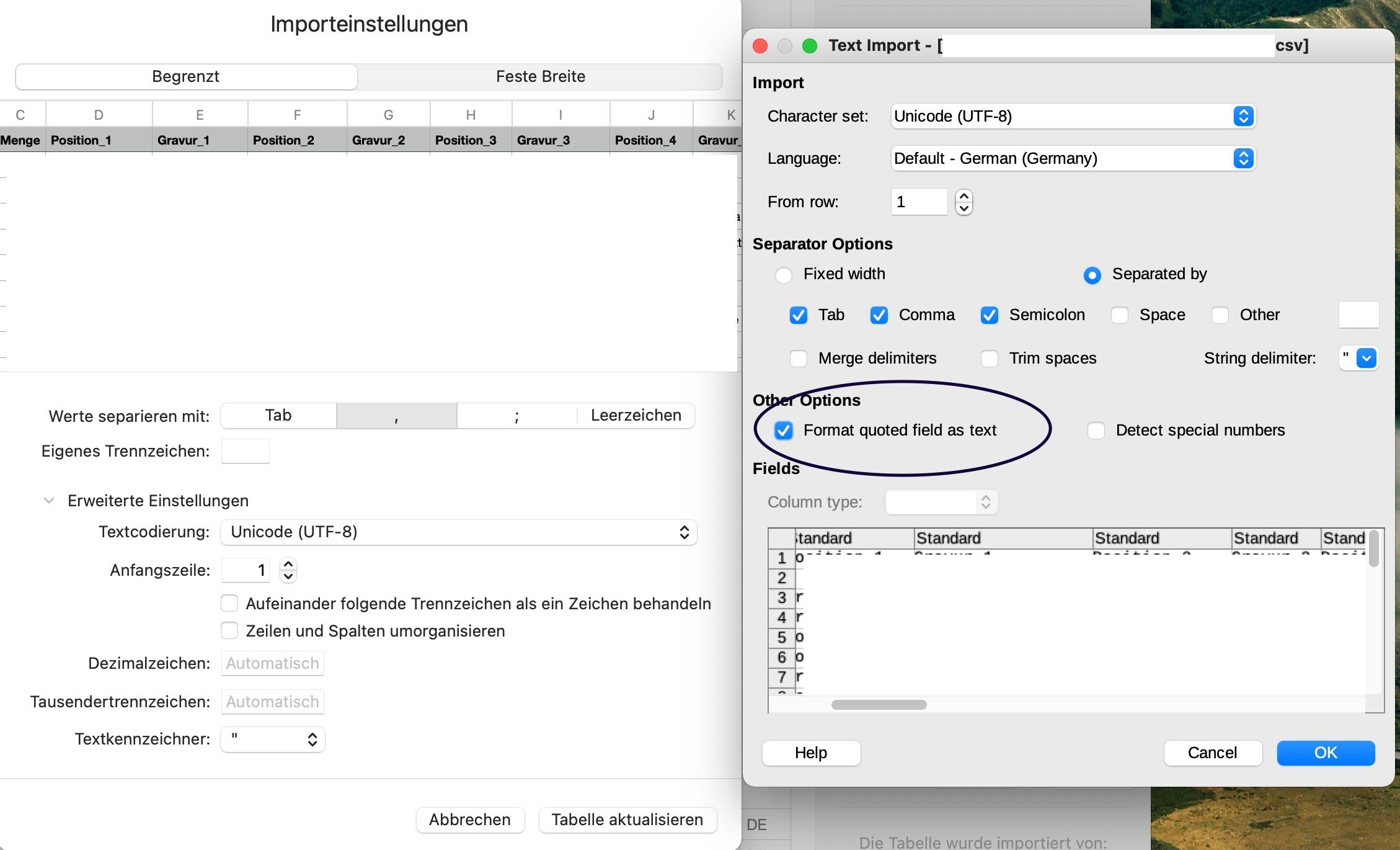 Wenn ich eine CSV Datei mit Numbers öffne, möchte ich das dass bestimmt Zellen automatisch in Text formatiert werden, da ansonsten z.b die erste Null in manchen Zellen fehlt.