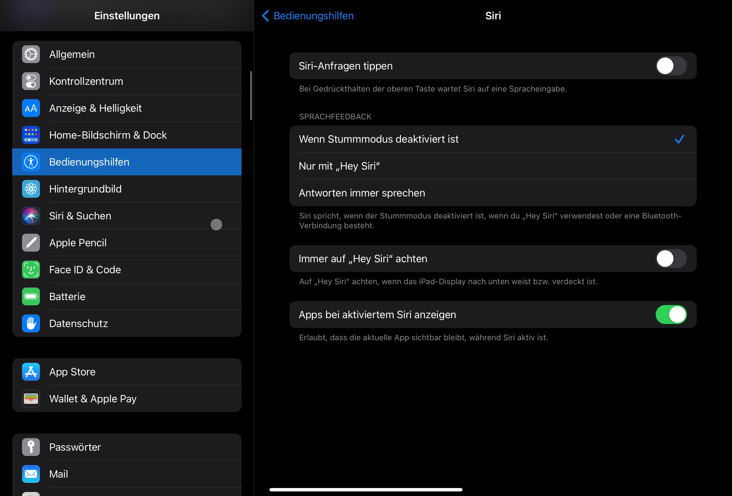 Ansonsten auch mal in Einstellungen und Bedienungshilfen schauen, dass beim vorletzten Punkt „Siri-Anfragen tippen“ der Schalter auf „aus“ steht.