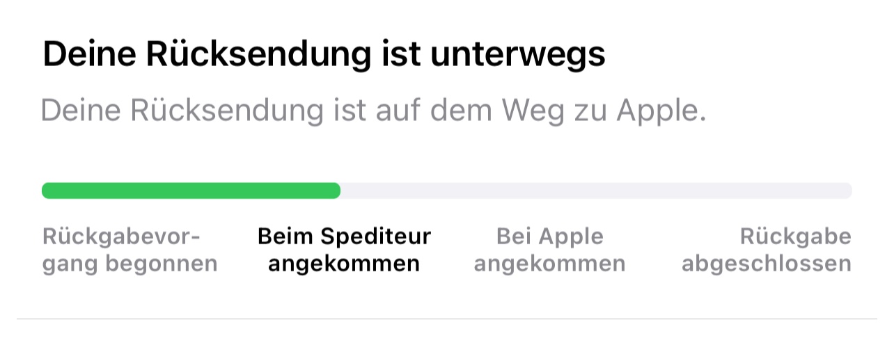 ich habe mein MacBook, sowie die AirPods die es zum Bildungsrabatt gab, retourniert. UPS hat die Geräte am Donnerstag abgeholt und Freitag bereits in die Niederlande zum Lager gebracht. Seitdem hat sich am Status „Beim Spediteur angekommen“ nichts geändert, obwohl da doch eigentlich bereits „Bei Apple angekommen“ stehen müsste.