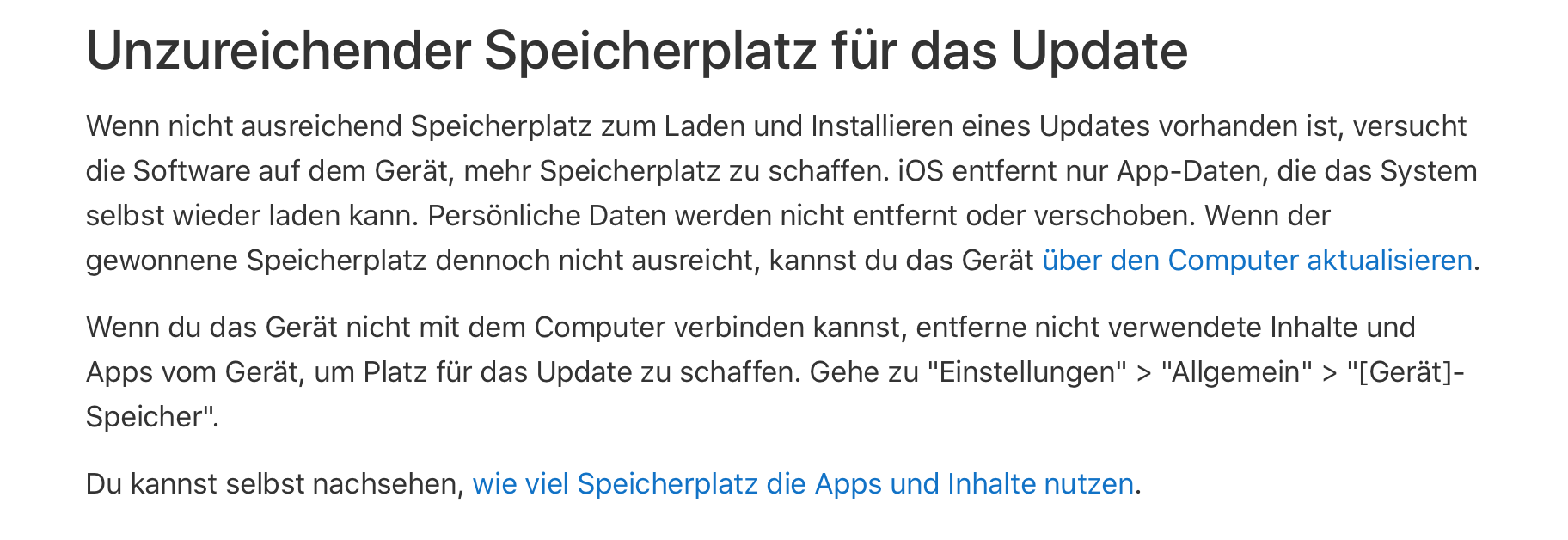 Es könnte daran liegen, dass zu wenig Speicher auf deinem iPhone zur Verfügung steht; schau einmal in die nachfolgenden Seiten des Apple Support