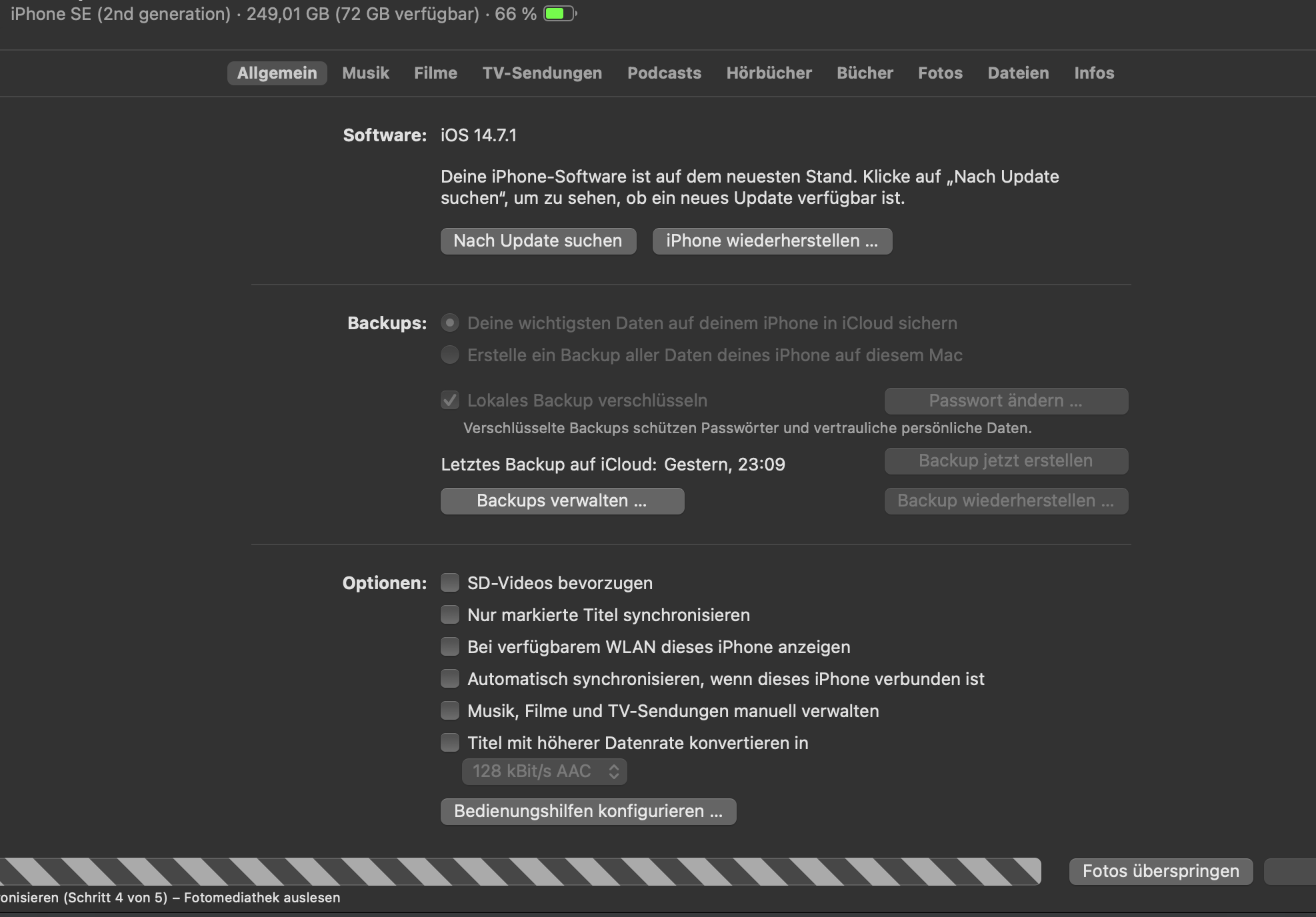 Das Finder-Fenster mit der Ansage "Schritt X-1 von x, Fotomediathek auslesen"