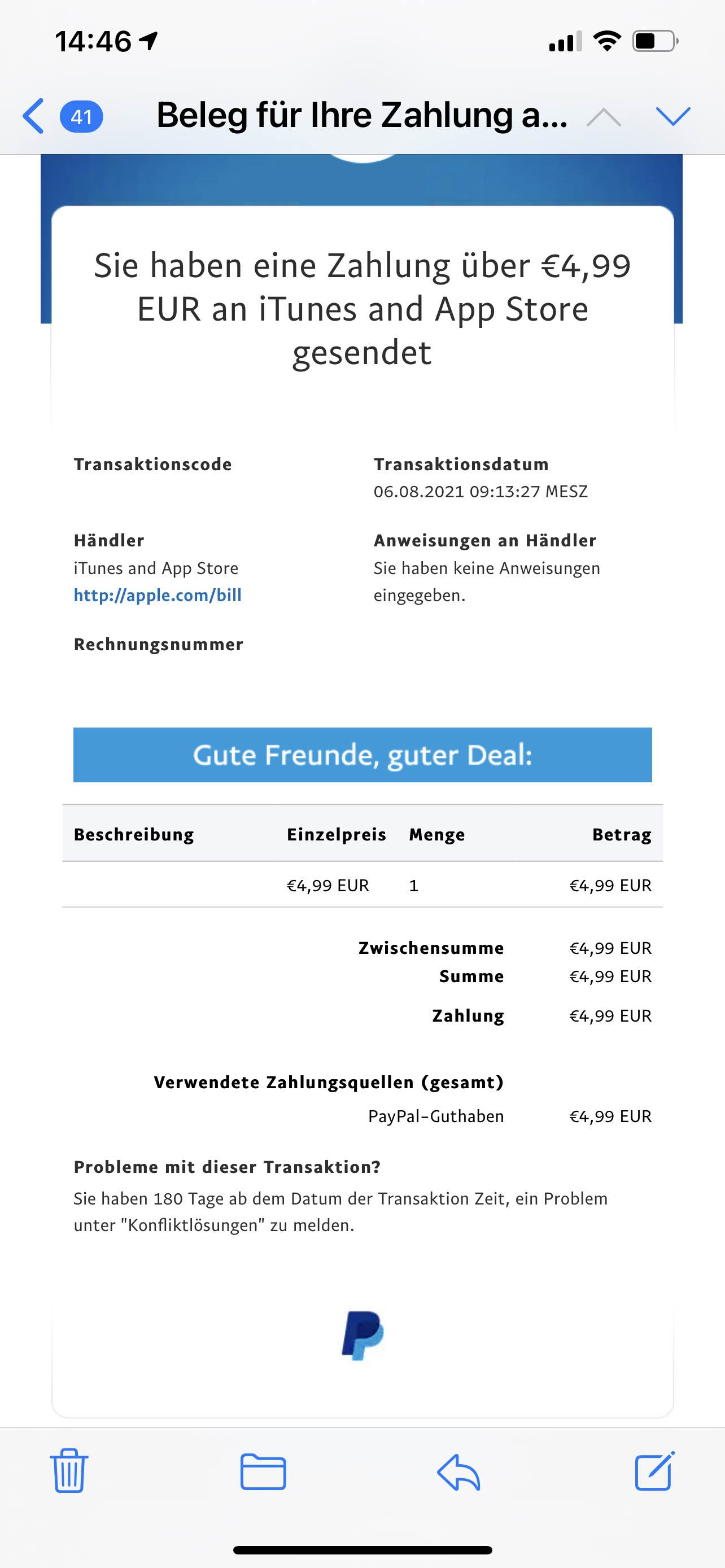 Mit dem Transaktionscode *** haben Sie 4,99€ Von meinem Konto abgebucht. Ich finde die Zahlung jedoch nicht auf meinem iTunes Konto und ich weiß auch nicht wofür die Abbuchung ist.