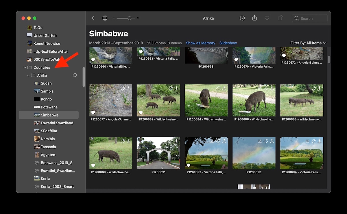 Als ein Beispiel, Ordner, die Alben mit Fotos nach dem Kontinent und Land gruppieren:
