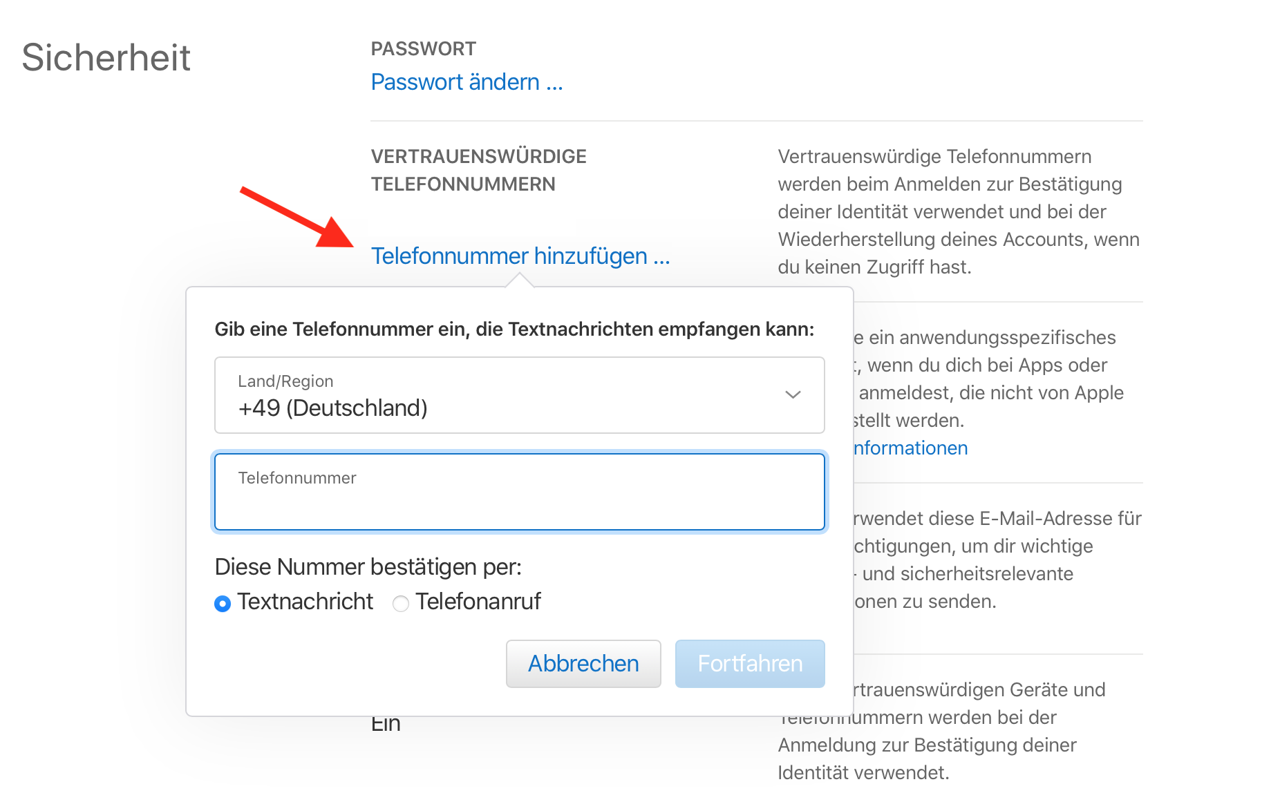 hier die neue Telefonnummer eingeben und auswählen, wie Bestätigung erfolgen soll, dann --> Fortfahren.