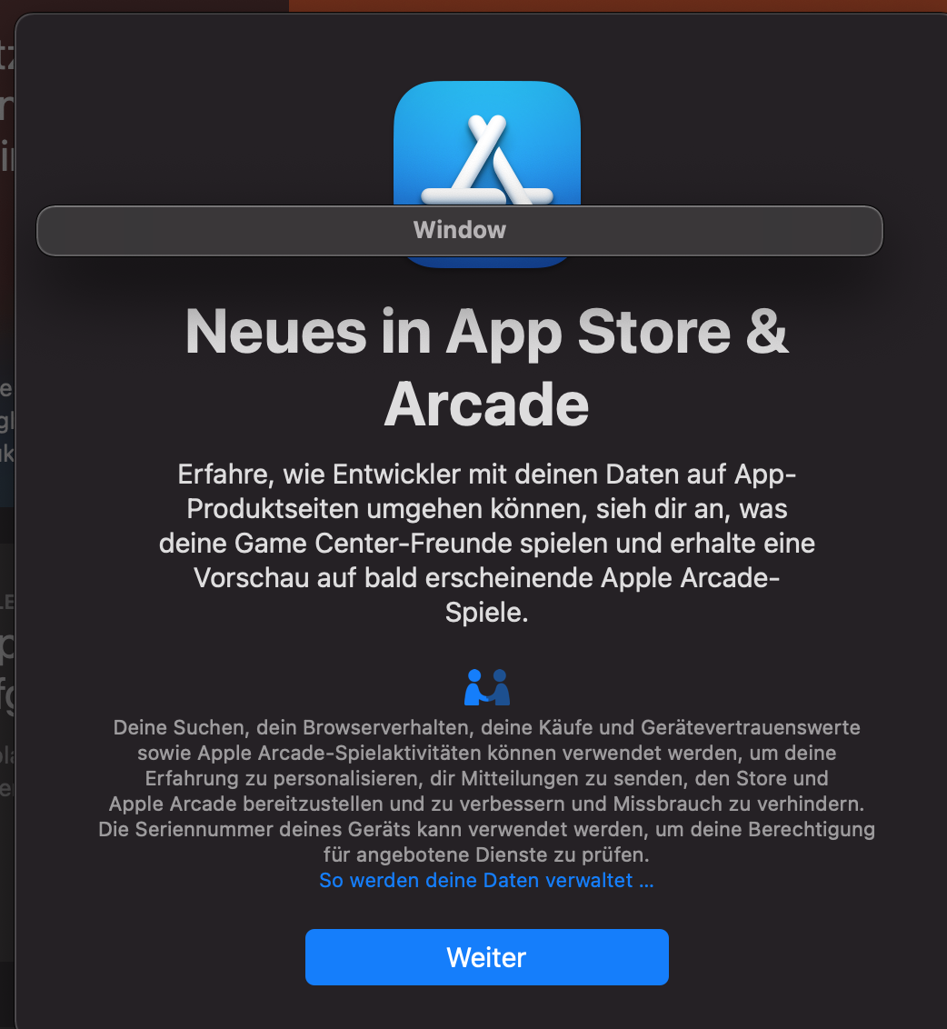 nach dem Betriebssystem upload auf meinem Macbook Pro auf BigSur wird beim öffnen der App Store App das Feld - Window - angezeigt. Die App ist quasi eingefroren und nicht bedienbar.