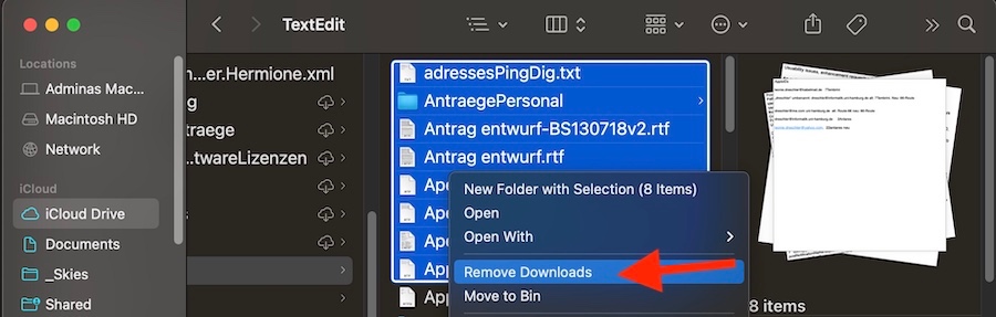 • Wähle Ordner oder Dokumente auf iCloud Drive aus, rechts-klicke die Auswahl oder halte die Taste Strg (Ctrl) gedrückt, während du auf die Auswahl klickst, dann benutze das Kommando "Download entfernen" für die ausgewählten Objekte. Die Originale werden in iCloud bleiben, und nur die lokale Schattenkopie wird entfernt.