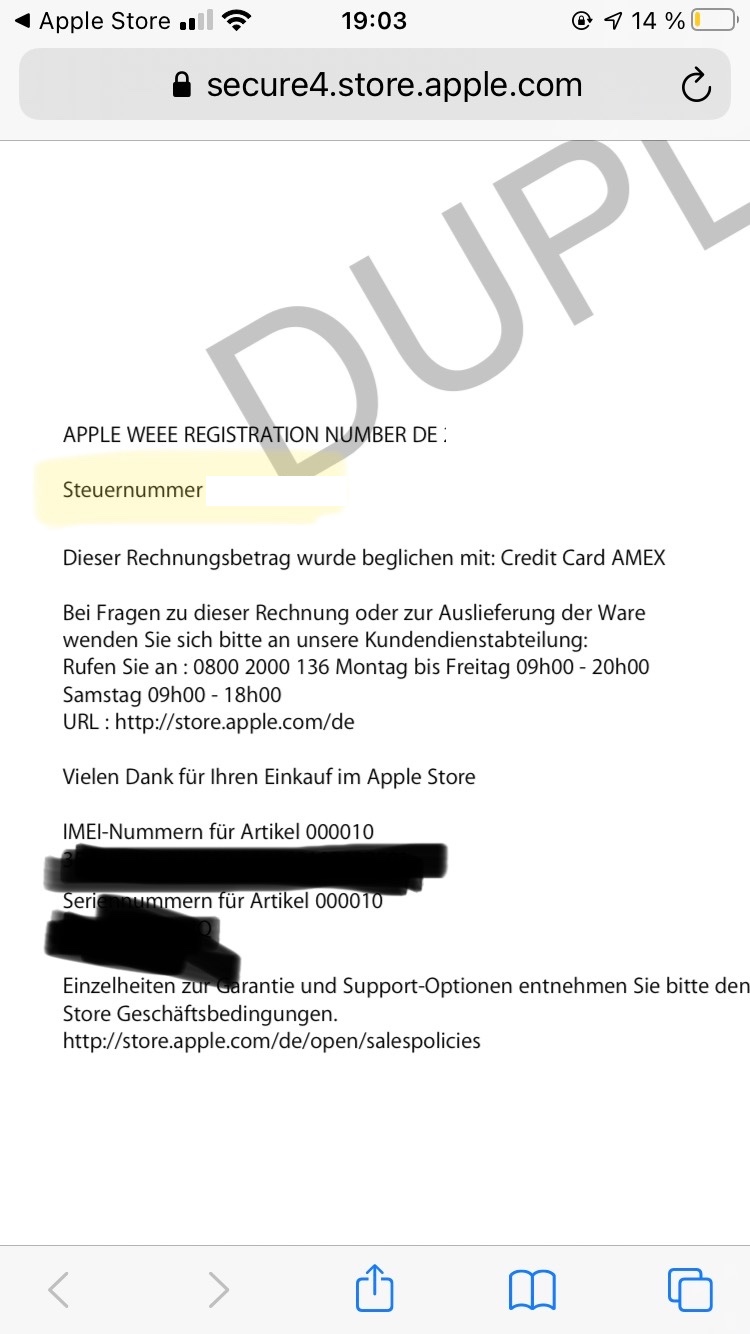 Ich hänge mal ein Bild an um welche Steuernummer es geht. Ich habe diese nicht geschwärzt da ich nach Rücksprache mit Freunden und Bekannten erfahren habe das diese auf jeder Rechnung aus Apples Online Shop steht: