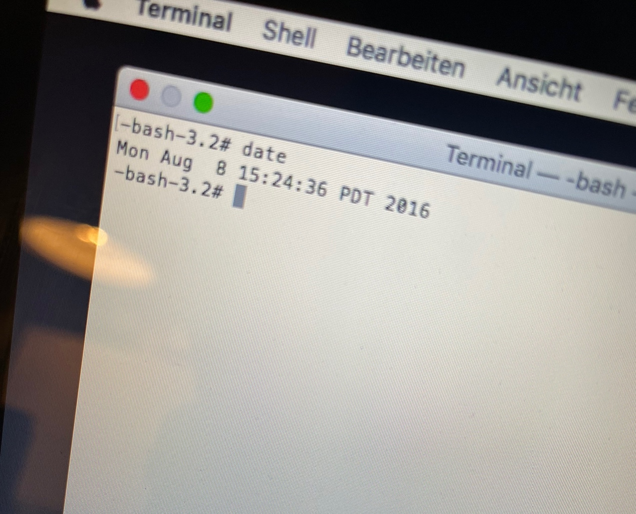 Achte auf die Bestätigung des Datums im Terminal-Fenster: Mo 8 Aug 2016 15:00