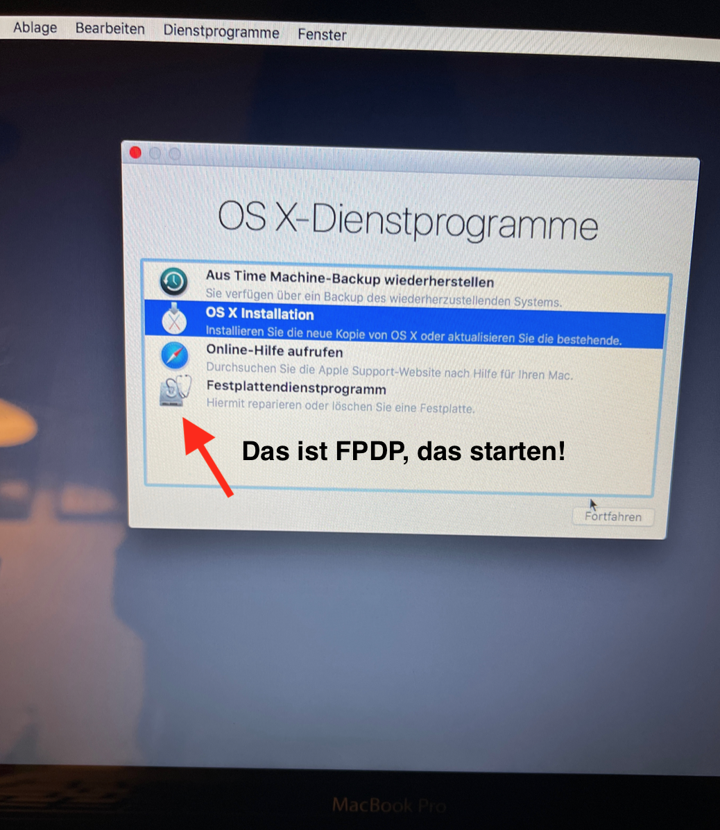 Jetzt kannst du nach Belieben fortfahren; Festplatte mit FPDP löschen (extended journaled), wodurch natürlich alle Daten auf dem Laufwerk unwiederbringlich gelöscht werden, oder du überprüfst mit FPDP lediglich dein Startlaufwerk und reparierst es, wenn nötig, und klickst dann auf "OS X erneut installieren", wodurch El Capitan über dein altes System installiert wird.