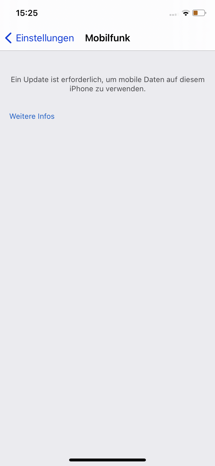 Ich kann meinen mobil Funk nicht anschalten. Wenn man in die Einstellungen geht steht ein Fehler ist aufgetreten, wenn man dann darauf drückt wird man zur Apple Seite weitergeleitet die einem sagt man solle die aktuelle Software über denn Computer laden. Ich habe aber bereits die aktuelle Software ios:14.7.1. Könnte mir vielleicht jemand zurück schreiben wie ich wieder mobile Daten benutzen kann.