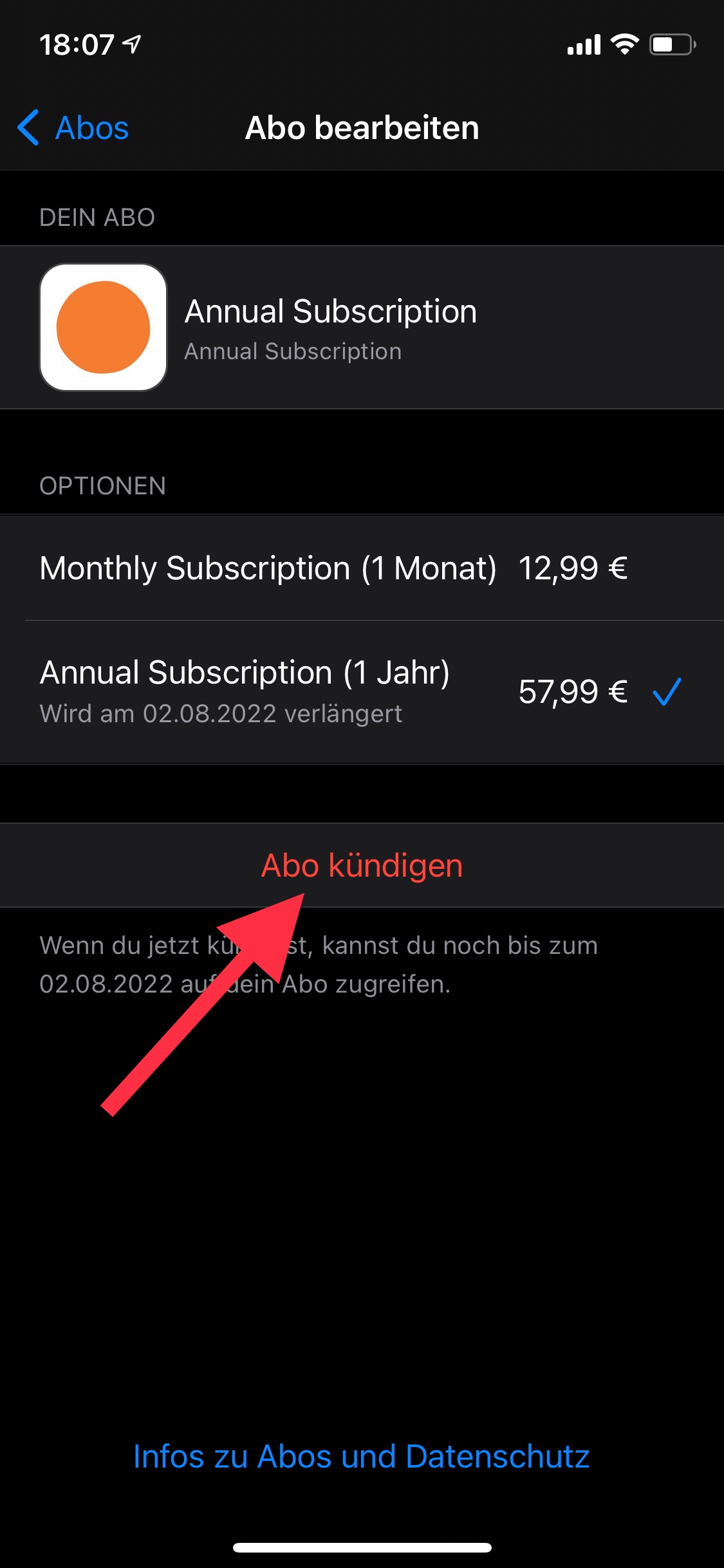 Dein Abo sollte unter "Aktiv" aufgelistet sein. Unter deinem Abo sollte dann entweder "Wird am [Datum] verlängert" oder "Läuft am [Datum] ab" angezeigt. Letzteres bedeutet, dass dein Abonnement bereits gekündigt ist und du nichts weiter unternehmen musst. Sollte der erste Text angezeigt werden, dann musst du auf das entsprechende Produkt tippen, ganz nach unten scrollen und dort "Abo kündigen" auswählen.