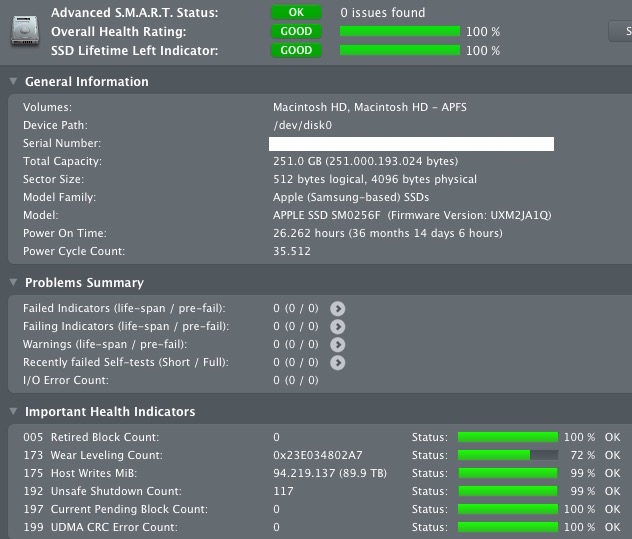 Die system-/OS-seitige Unterstützung läuft seitens Apple eh nächstes Jahr aus, hätte aber gerne eine Einschätzung, ob die Kiste bis dahin noch hält. Fehlermeldungen oder defekte Daten gab's bisher keine, in der Regel habe ich auch über 100GB frei.