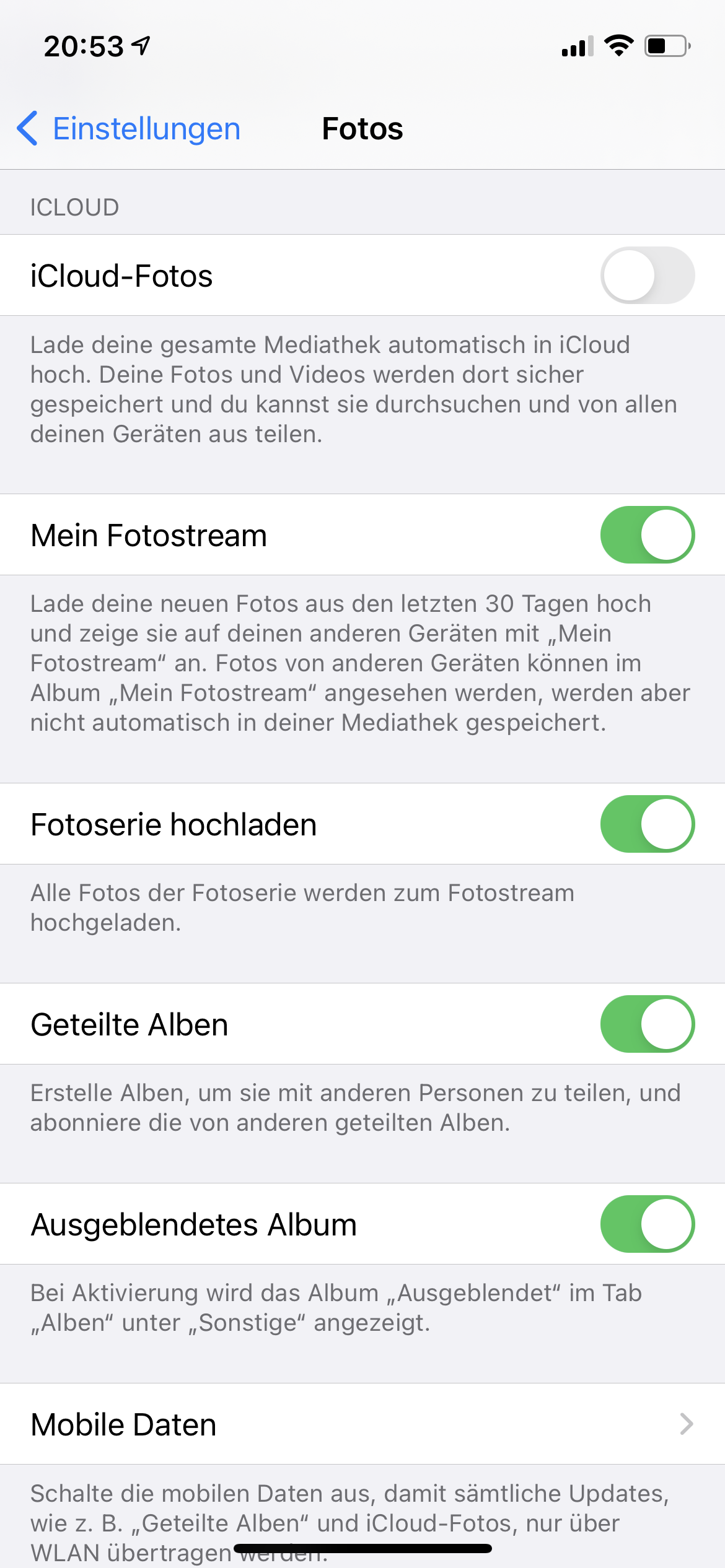 Naja - Fotostream habe ich deaktiviert. Das lädt die Fotos aus den letzten 30 Tagen hoch - können auf dem mac oder sonst angeschaut werden, mehr nicht. In die Fotomediathek übernehmen, geht nicht. Ist also rein eine Funktion zum Ansehen. Dagegen auf dem mac - die Einstellungen habe ich auch - Originale auf dem mac. Dadurch werden die dann bei einem backup mit Time machine gesichert. Und auf dem Mac ist meist genug interner Speicher. Viele Grüsse Gerhard