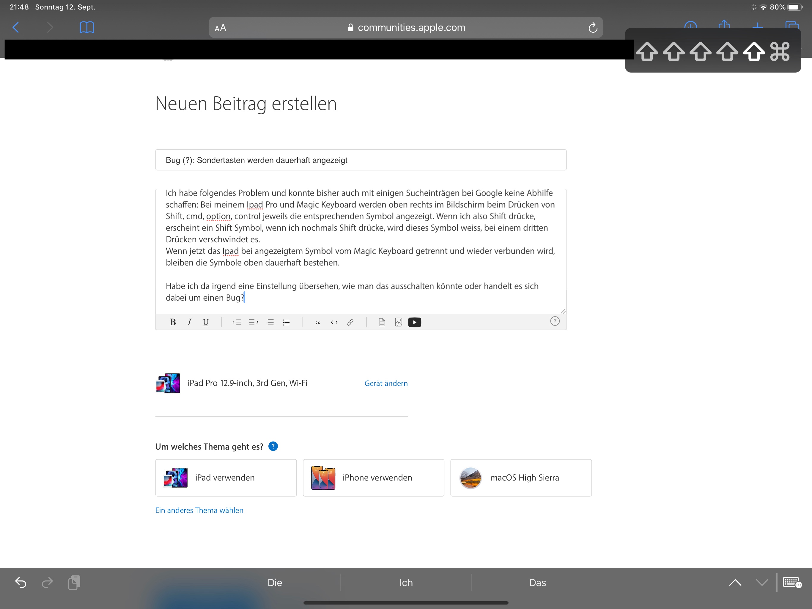 Ich habe folgendes Problem und konnte bisher auch mit einigen Sucheinträgen bei Google keine Abhilfe schaffen: Bei meinem Ipad Pro und Magic Keyboard werden oben rechts im Bildschirm beim Drücken von Shift, cmd, option, control jeweils die entsprechenden Symbol angezeigt. Wenn ich also Shift drücke, erscheint ein Shift Symbol, wenn ich nochmals Shift drücke, wird dieses Symbol weiss, bei einem dritten Drücken verschwindet es.