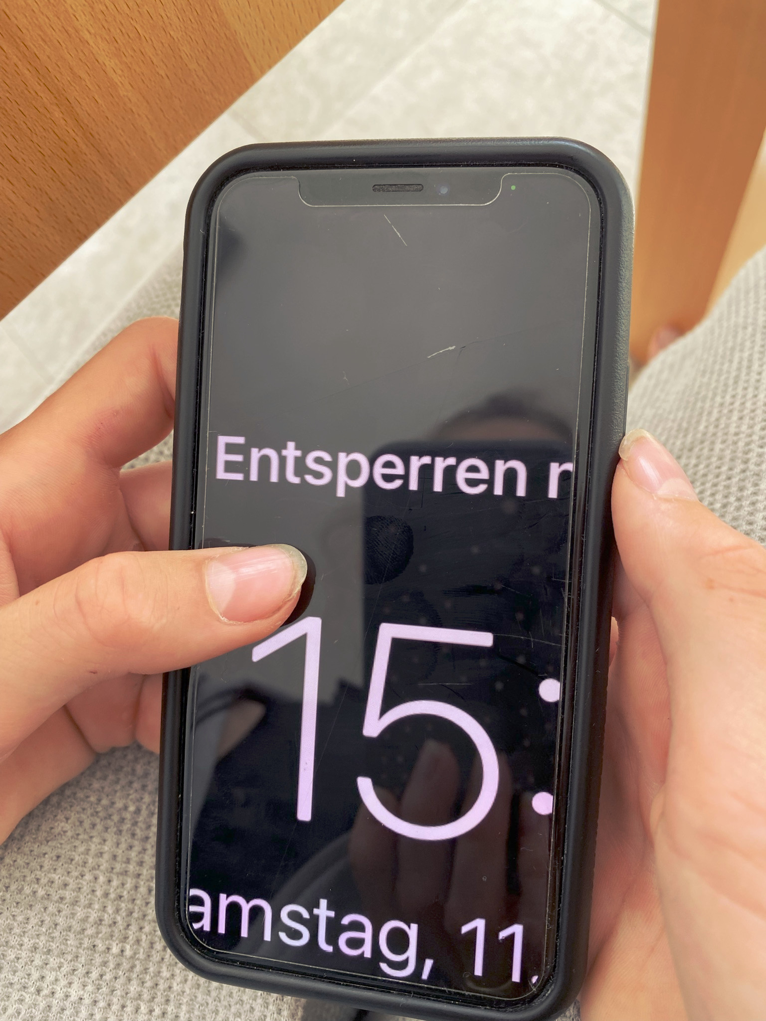 Die Display-Anzeige (wenn ich das Gerät - IPhone XS - entsperren möchte) erscheint so groß, dass ich nicht alles lesen kann (ca. 4-8 mal größer als sonst). Somit kann ich auch nicht auf alle Funktionen zugreifen und das Gerät nicht entsprren. Die Face-ID funktioniert in diesem Moment auch nicht. In seltenen Fällen habe ich es trotzdem geschafft, das Gerät komplett auszuschalten. Funktioniert auch das nicht, ist die einzige Lösung abzuwarten bis der Akku leer ist. Wenn ich das Gerät dann wieder neu einschalte, ist alles "normal".