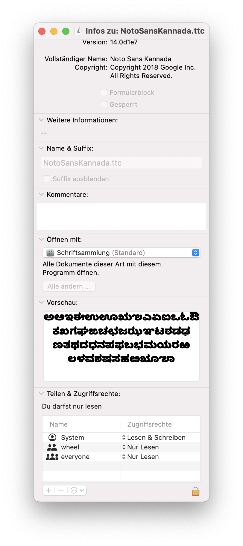 Wenn ich über den Finder gehen und die Informationen der Datei abrufe, wird mir gesagt, dass ich nicht die nötigen Rechte habe, den Lese- und Schreibzugriff zu ändern. Dabei bin ich alleiniger User und Admin auf meinem Rechner. Löschen kann ich die Datei folglich auch einfach nicht so im Finder.