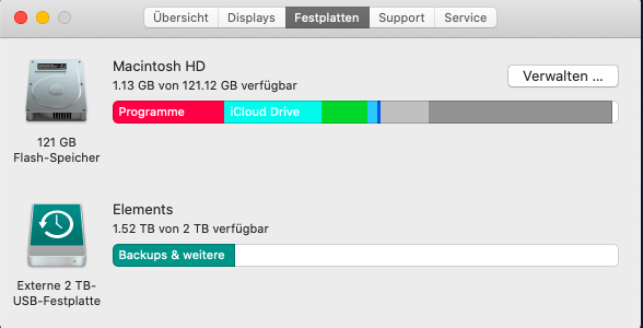 Ich kann kein Backup mit der externen Festplatte mehr machen, es kommt immer die Meldung dass nicht genügend Speicherplatz frei ist, jedoch sind noch 2 TB verfügbar.