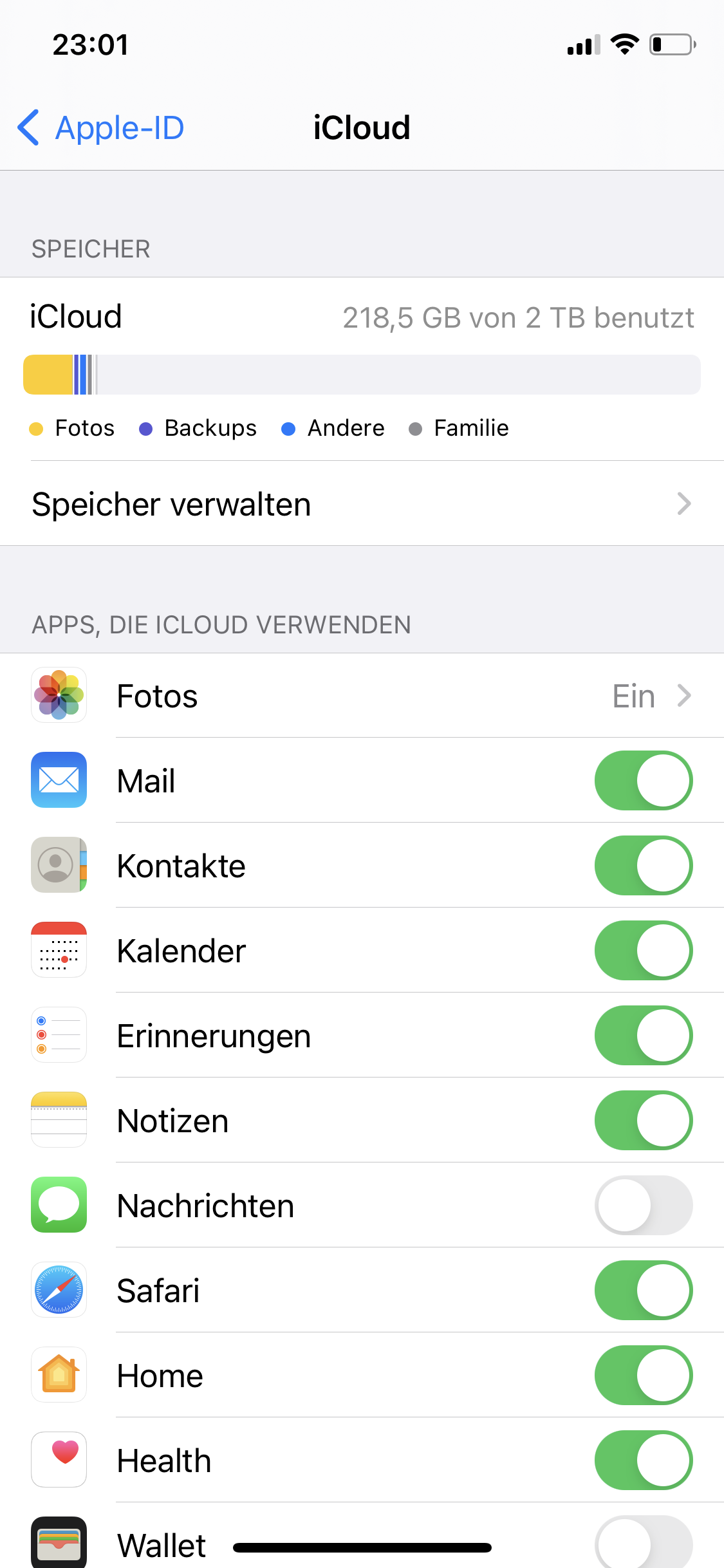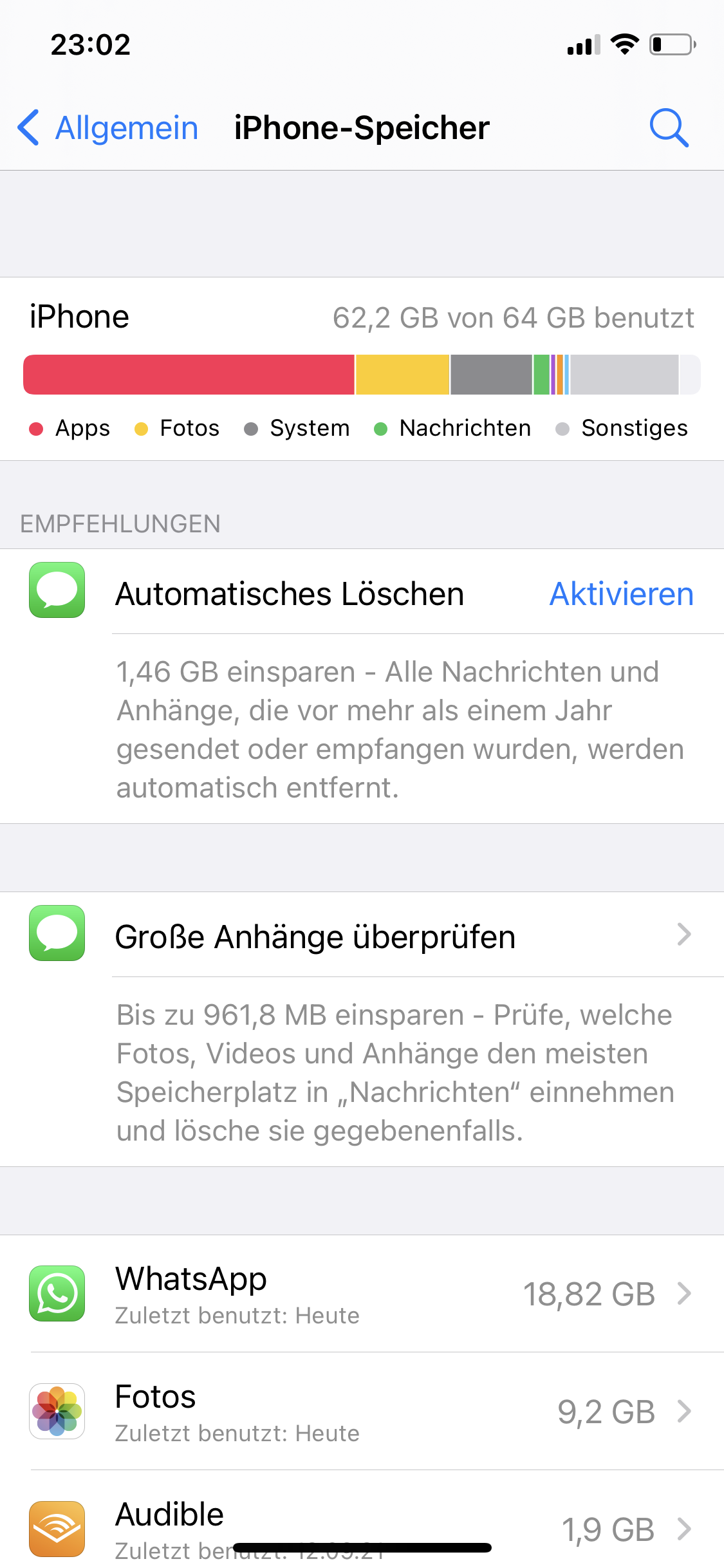 WhatsApp verbraucht auch viel Speicherplatz, daher zumindest ein Backup über WhatsApp in iCloud machen, damit man dort auch einmal die unnötigen Fotos oder Videos löschen kann. Wenn man in WhatsApp bei den Fotos auf "Sichern" tippt, werden diese Bilder in der FotoApp gesichert, und man könnte sie mit dem Rest der Fotos auf dem Computer sichern.