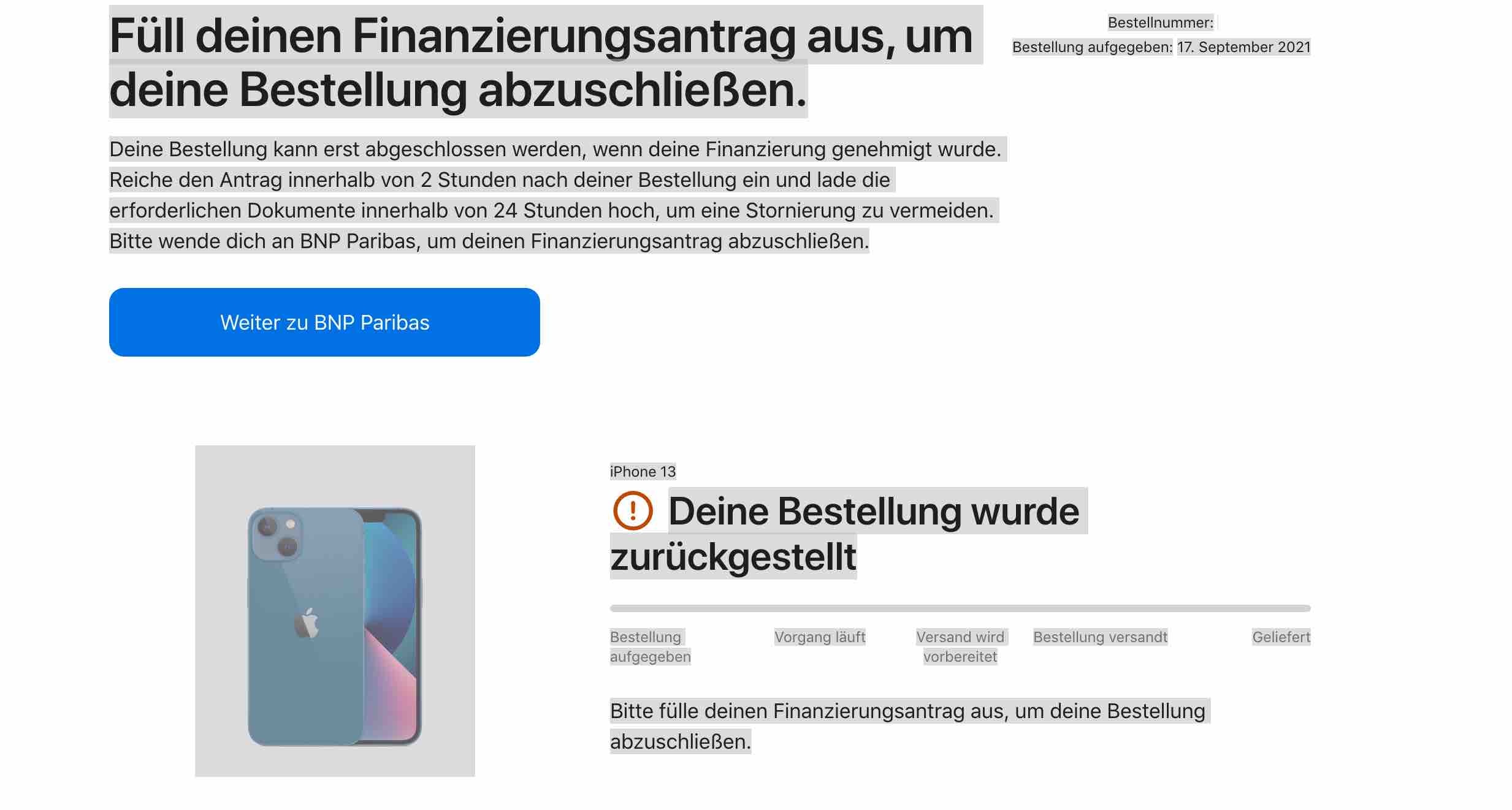 Habe heute ein Iphone 13 mit Finanzierung über Consors Finanz bei Apple gekauft.Die Finanzierung wurde mit Web ID erfolgreich abgeschlossen. Aber das ist der Status auf der Apple Page nachdem ich auf den blauen Button klicke kommt die Fehlermeldung da ist was schiefgelaufen. Support schon 2 mal angerufen keine Ahnung. Antwort abwarten das kanns aber nicht sein oder