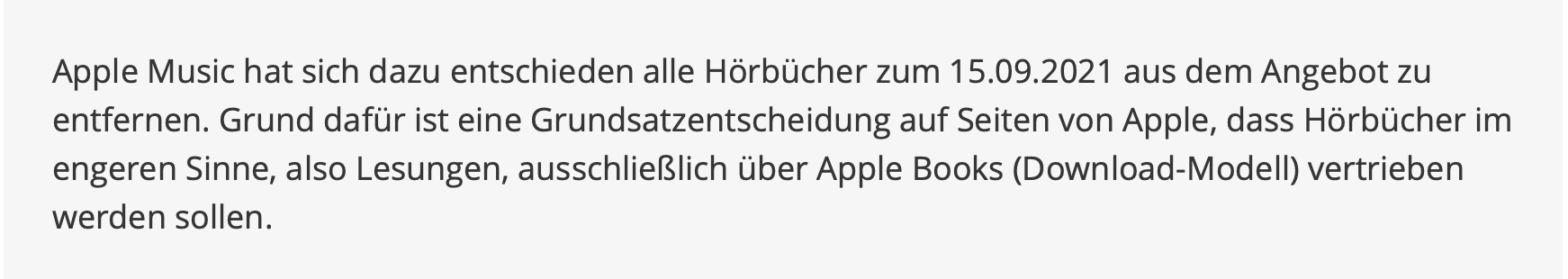 Ich habe seit einer Woche das Problem, wenn ich Hörbücher über Spook oder direkt über die Apple Musik App Downloaden oder direkt höre, kann ich irgendwann nicht mehr weiterhören, da die Titel in meiner Region nicht verfügbar sind…. Wie kann ich es einstellen, dass ich die Hörbücher weiterhören kann. Das Problem kam auch schon bei Musik Alben. Dieses Problem hatte ich bei spotyfi und Amazon Musik noch nie. Kann jemand helfen?