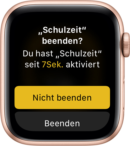 Tippe im Kontrollzentrum auf die Taste "Schulzeit", um die Funktion zu aktivieren. Um die Funktion zu deaktivieren, drehe die Digital Crown, und tippe dann zur Bestätigung auf "Beenden".