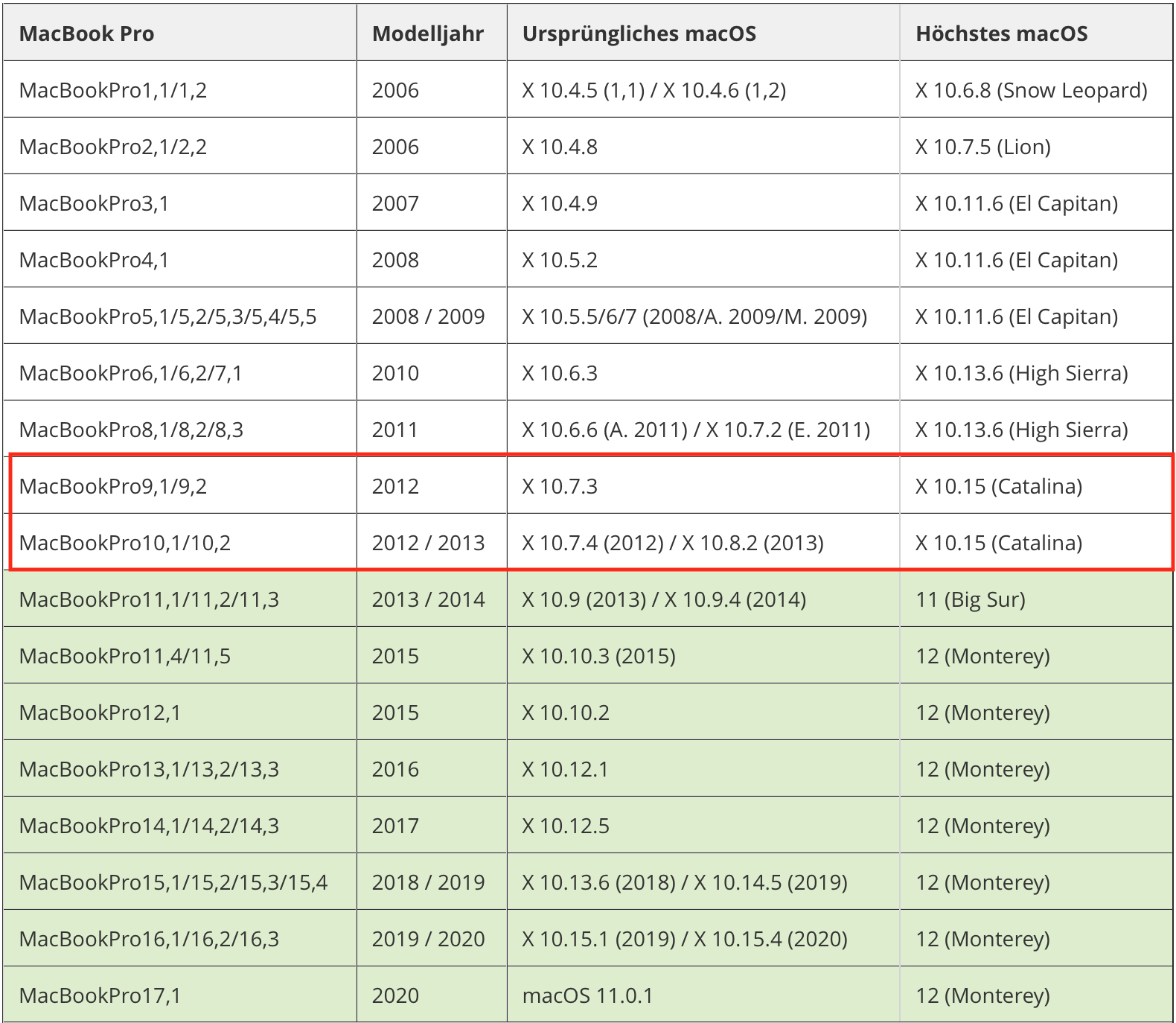 kann ich mein MacBook Pro (Mitte 2012) mit OS X 10.9.5 upgraden?
