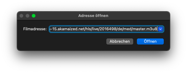 ℹ️Ein weiterer Notbehelf kann das AirPlay-Streaming des ZDF-LiveTV-Streams vom Mac, iPad oder iPhone auf den AppleTV4 sein. Dazu kann man z.B. die von mir oben verlinkten "HLS-URLs" direkt in den QuickTime-Player oder ins Adressfeld von Safari eingeben, siehe folgende Screenshots: