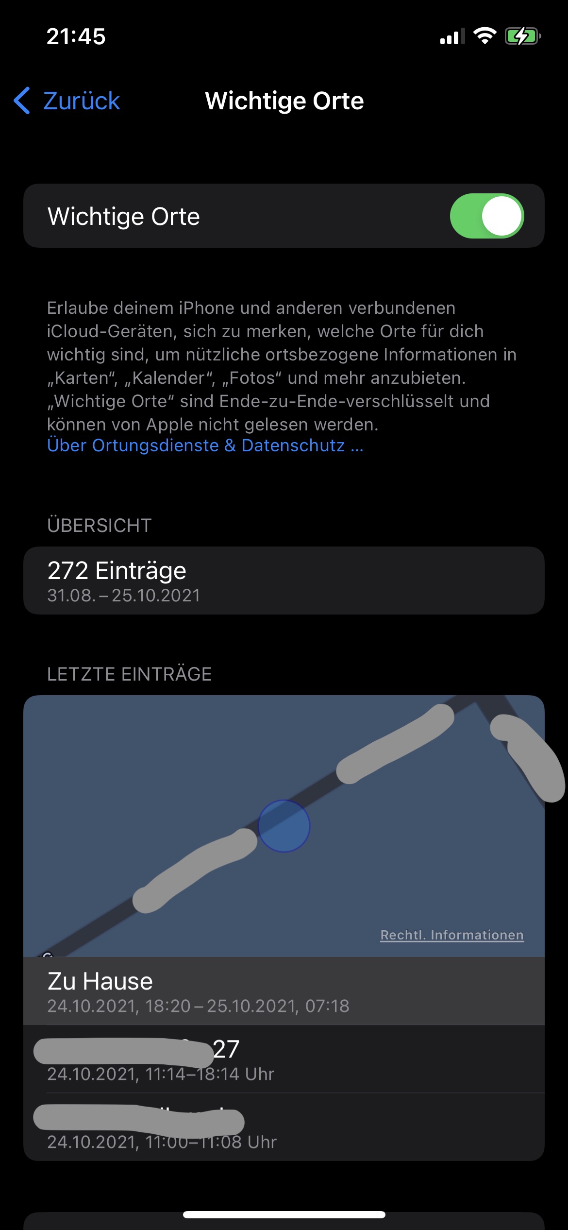 auch ich habe ein ähnliches Problem - bei mir wird leider nur noch ein Ort mit nicht mehr aktuellem Zeitfenster unter dem Kartenausschnitt gezeigt - alle anderen sind weg. Betrifft bei mir iPhone und iPad. Habe heute bei einem Kollegen die Einstellungen aufgerufen und auch dort sind die wichtigen Orte, die es laut Übersicht gibt, nicht aufrufbar.