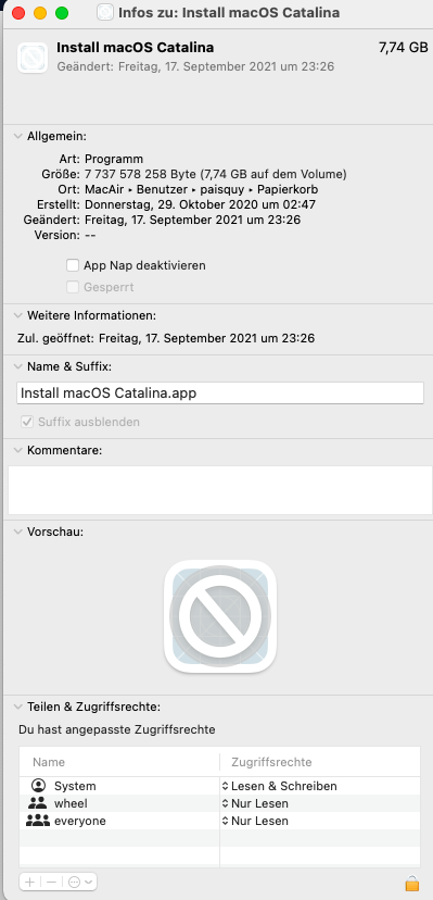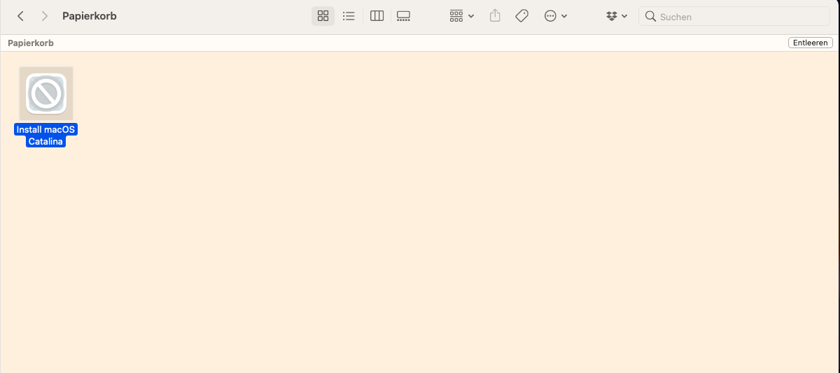 ich stehe vor folgendem Problem. In meinem Papierkorb liegt eine verwaiste Installationsdatei von MacOS Catalina, die sich partout nicht löschen lassen will. Da diese eine Menge Speicherplatz verbraucht, würde ich sie gerne loswerden.