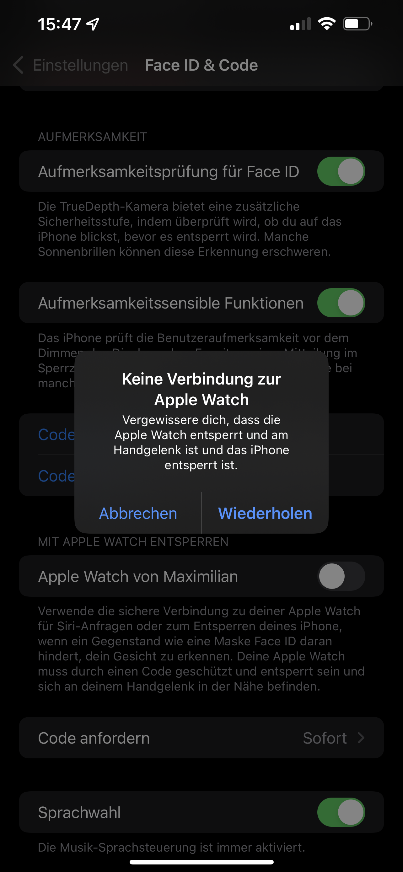 ich kann mein IPhone 13 pro max nicht mehr mit meiner Apple Watch (Series 4) entsperren. Beim Versuch, diese Funktion einzurichten, kommt jedes mal der Hinweis, dass eine Verbindung zur Apple Watch nicht möglich ist. Die Apple Watch befindet sich dabei aber entsperrt an meinem Handgelenk.