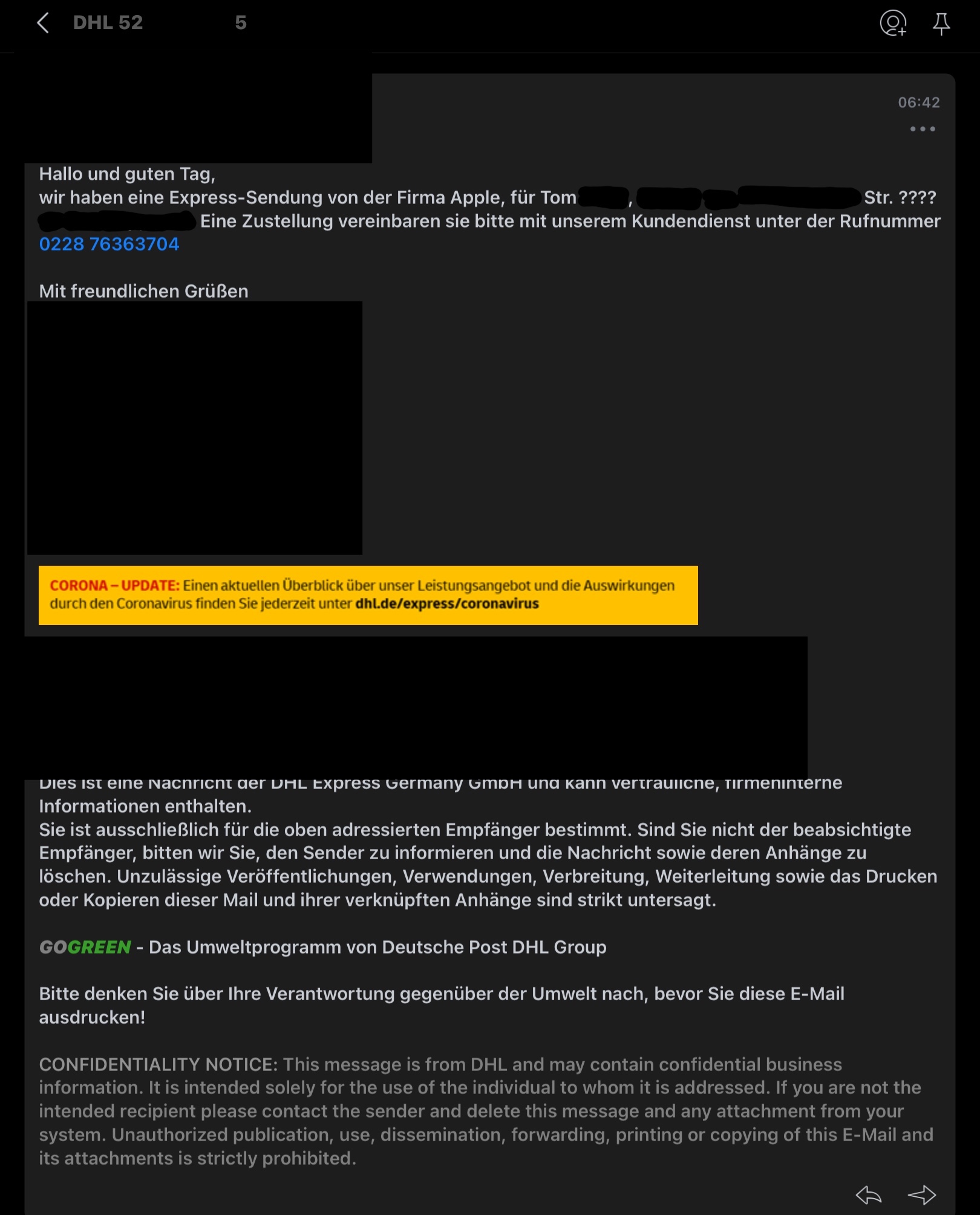 In der Sendungsverfolgung von Apple steht das die Lieferung schon 2 mal verzögert wurde. Jetzt habe ich eine eMail einer DHL Mitarbeiterin bekommen, die wie ich finde aber etwas verdächtig aussieht.