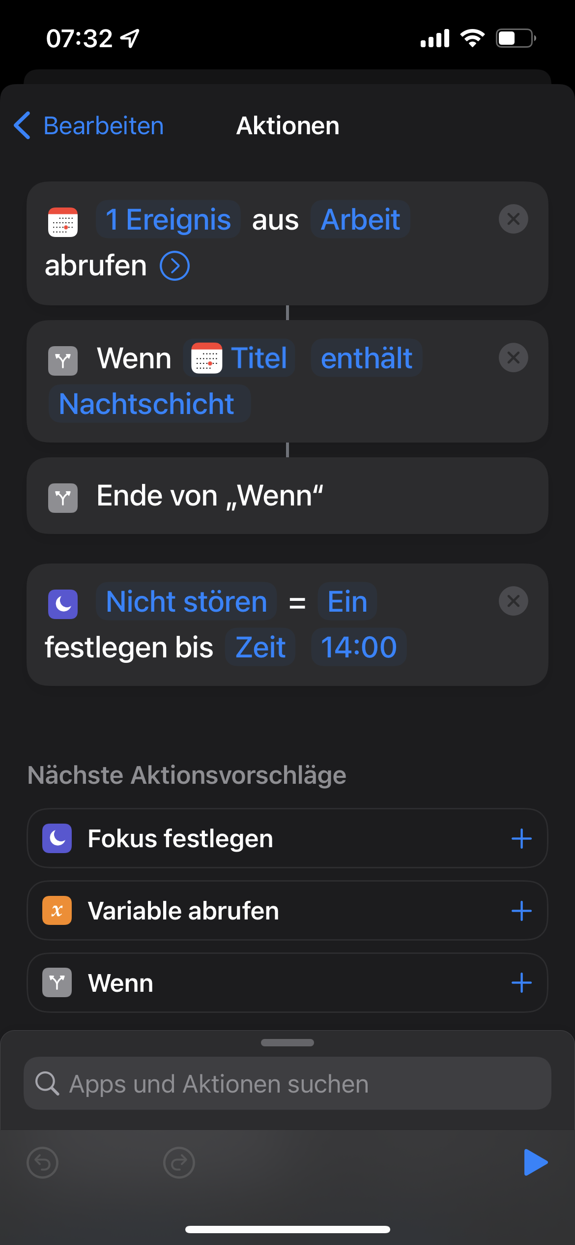 Die Hoffnung stirbt zuletzt, vielleicht kommt nextes ios-Update und der Kalendereintrag steuert den Focus, bzw. führt Kurzbefehle aus.