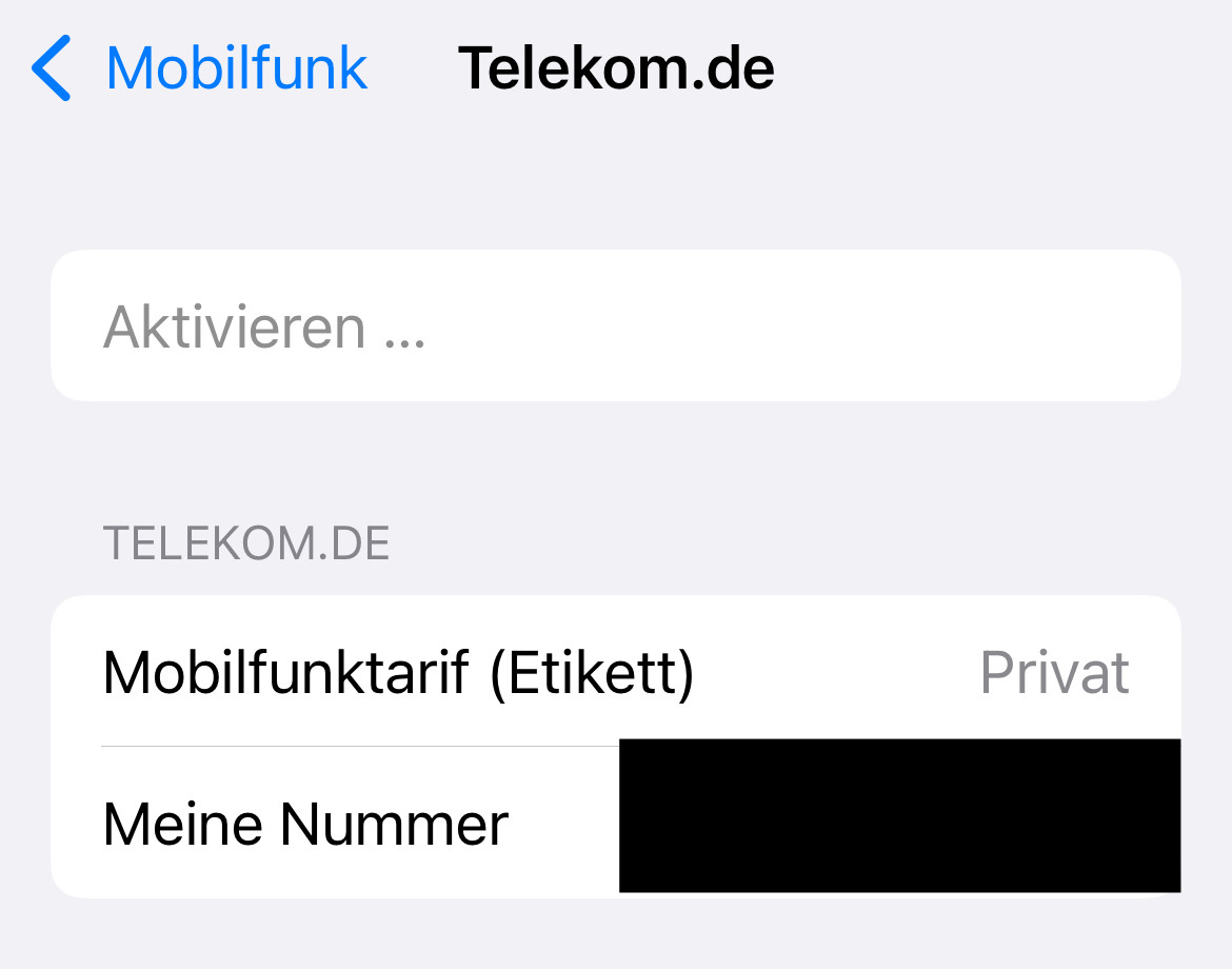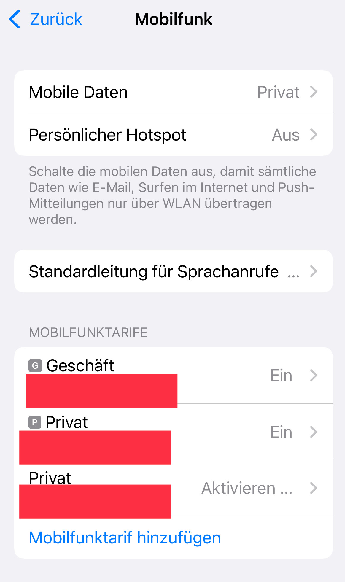 - neue eSim-Daten eingeben unter: Einstellungen > Mobilfunk > Mobilfunktarife > Mobilfunktarif hinzufügen > manuell Eingeben